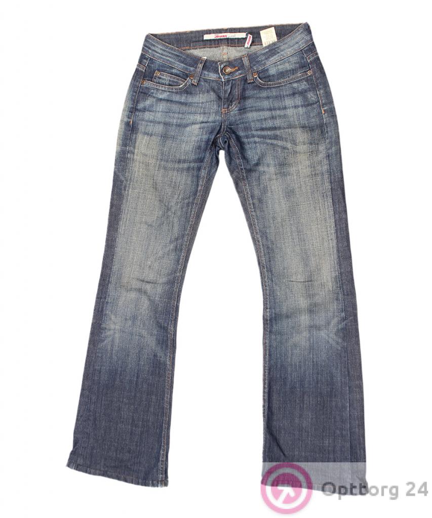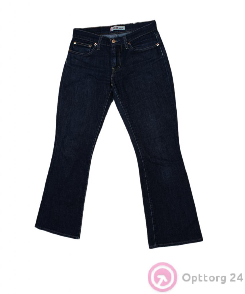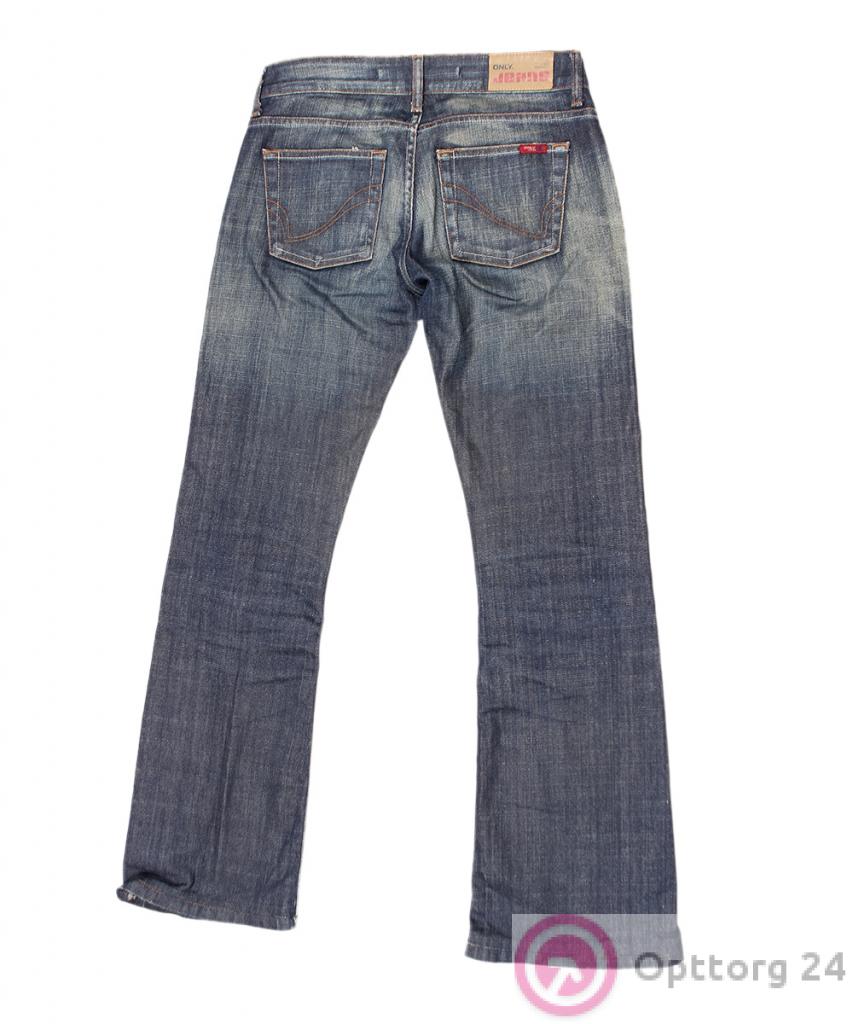Женские джинсы прямого кроя со слегка раслешенными брючинами. В изделии есть два кармана сзади.
