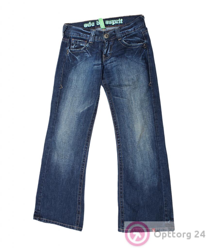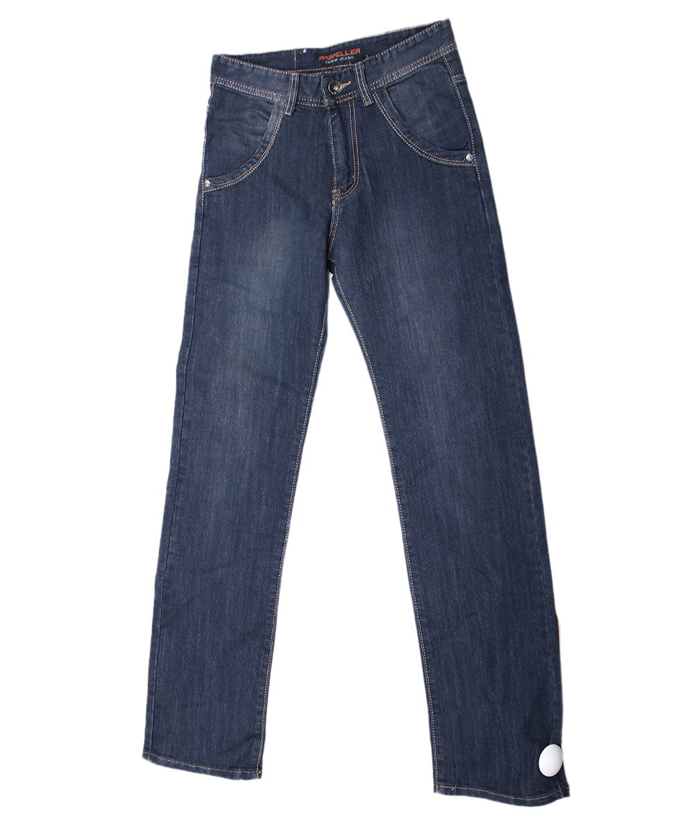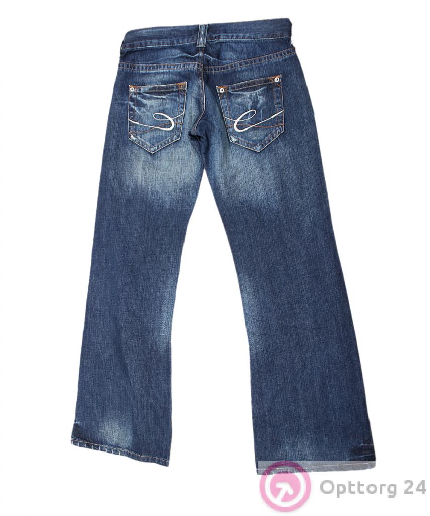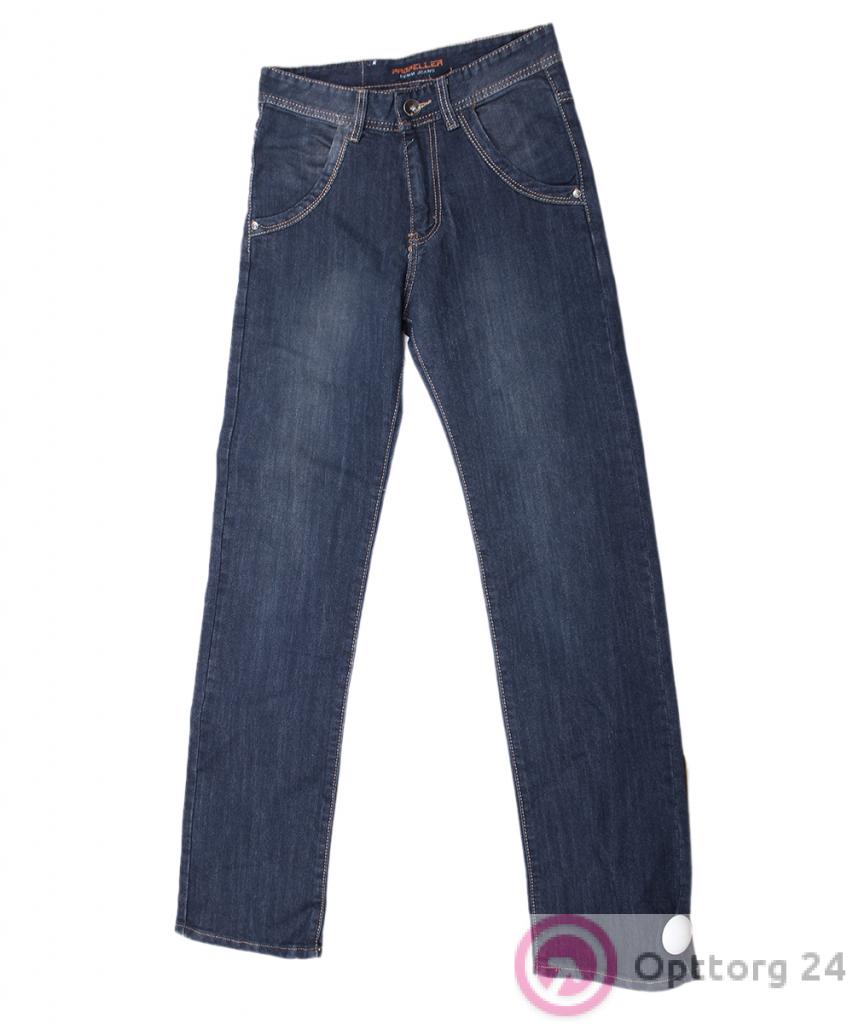 Удобные широкие джинсы классического синего цвета с тененными брючинами. Спереди есть три кармана, сзади - два кармана.