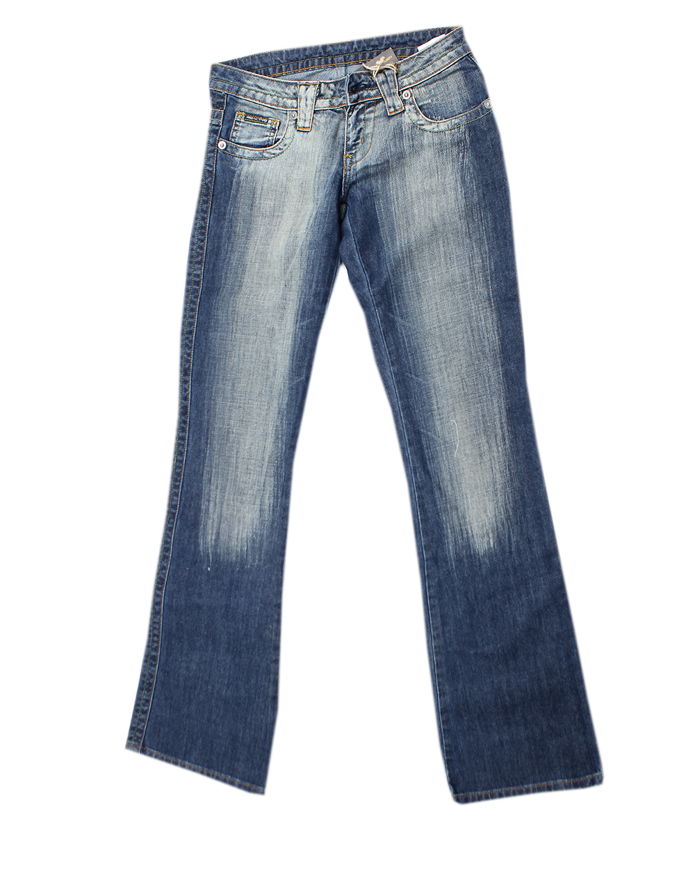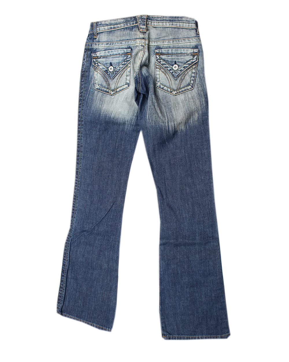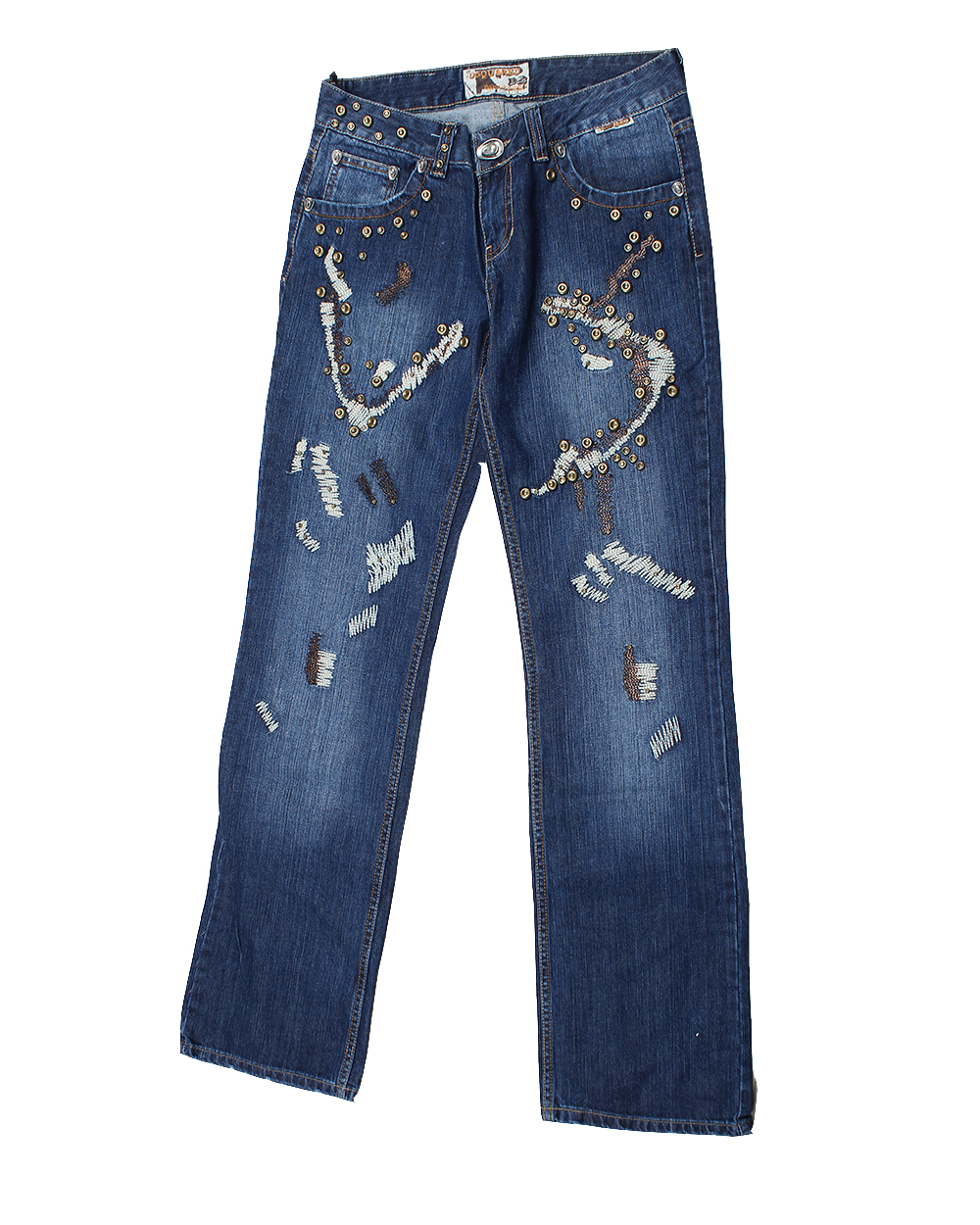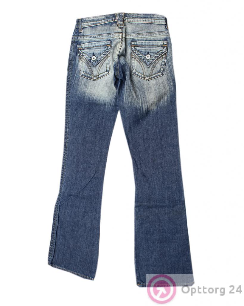 Женские джинсы синие с контрастными сильно высветленными полосами. Сзади два накладных кармана с пуговицами для украшения.