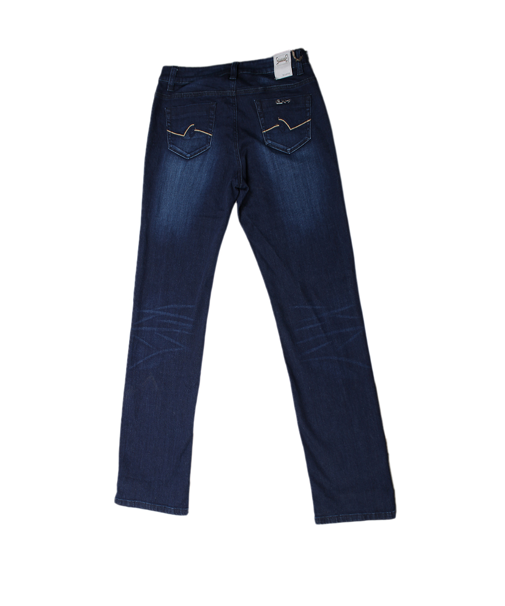 Прямые джинсы темно синего цвета для женщин. Карманы сзади дополнены абстрактной нашивкой.
