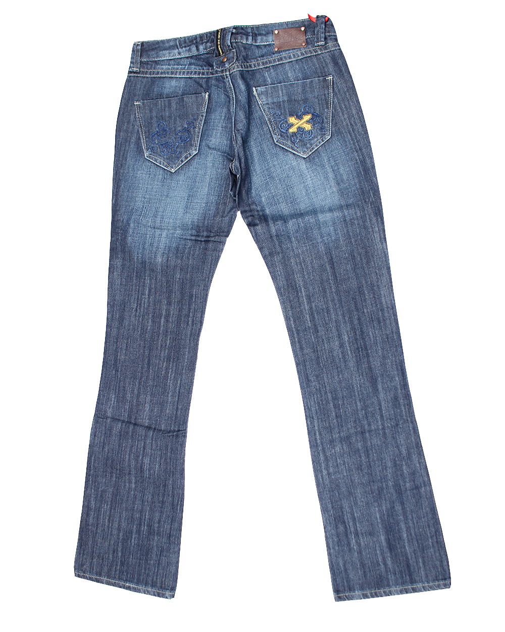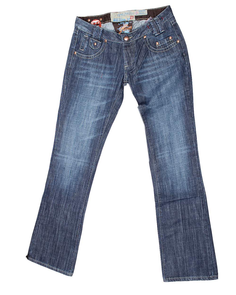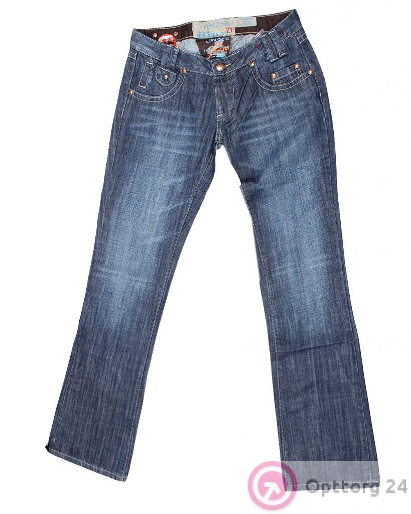 Прямые женские джинсы синего цвета. Изделие имеет высветленные спереди фрагменты.