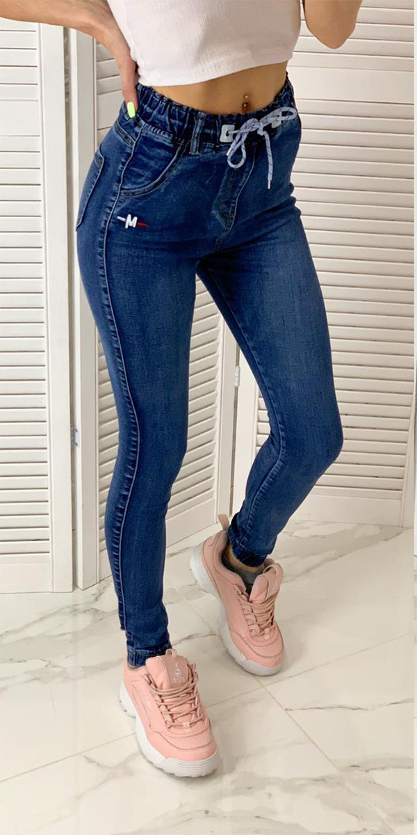 Описание: Джоггеры женские синего цвета с потертостями, зауженные, с высокой талией. Пояс на резинке и есть бежевый шнурок. Низ брючин на резинке. Есть шлевки под ремень. Есть четыре кармана.
