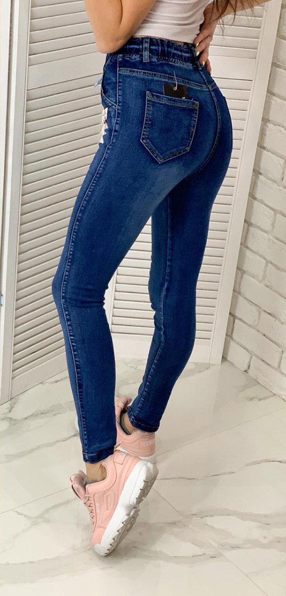 Описание: Джоггеры женские синего цвета с потертостями, зауженные, с высокой талией. Пояс на резинке со шнурком. Есть шлевки под ремень. Есть четыре кармана.