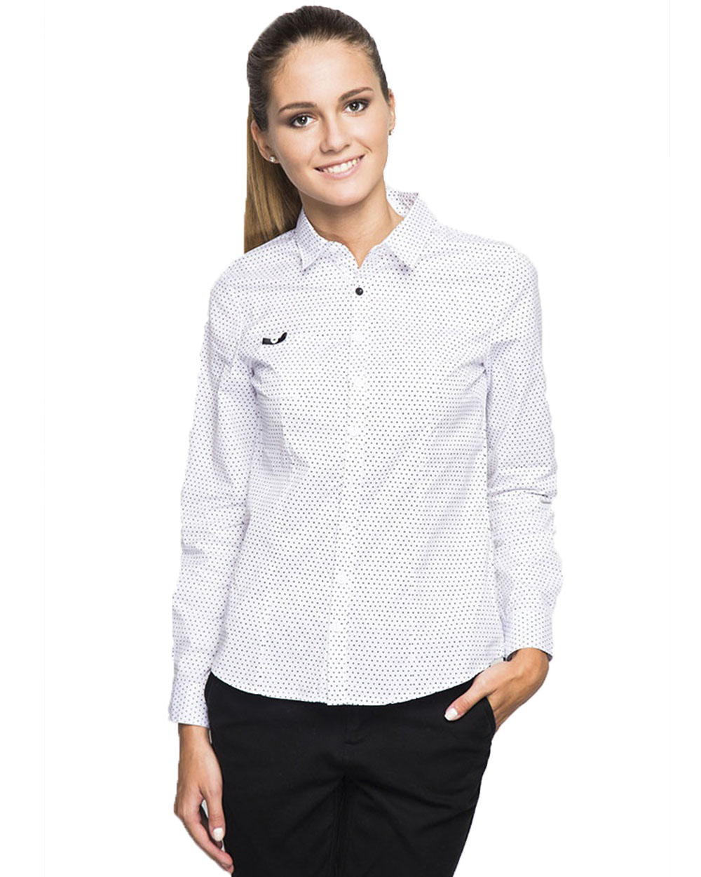 Женская блузка белого цвета в черный горох. Модель украшена одной черной буговицой у воота.