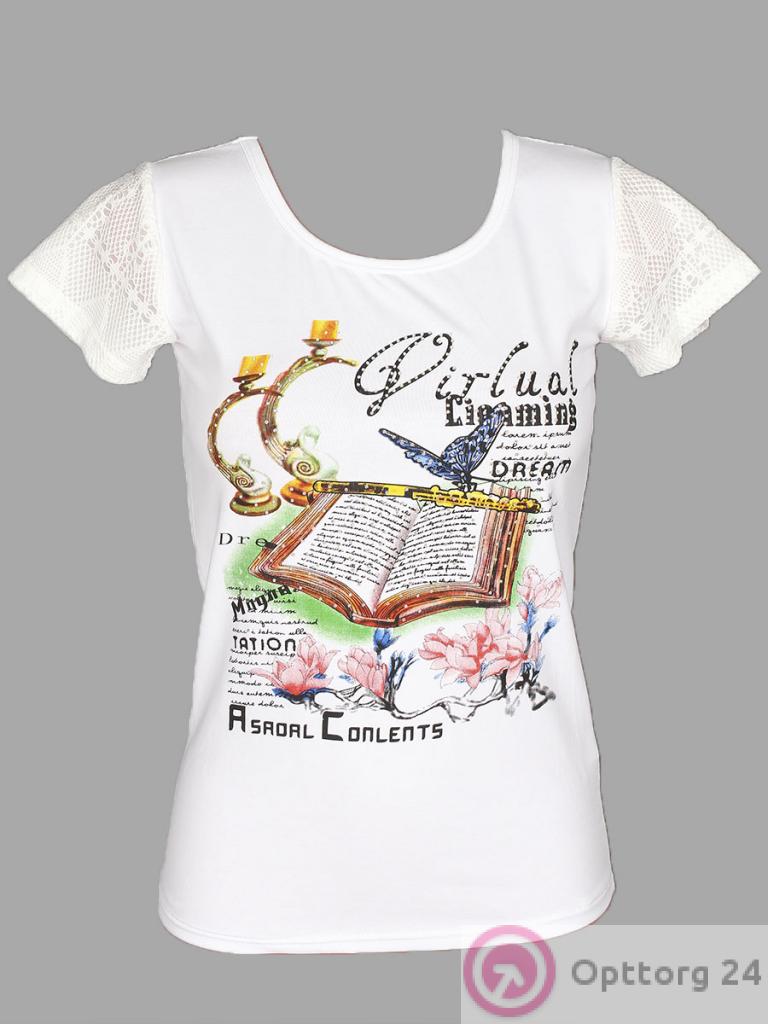 Футболка белого цвета с ярким красочным принтом на передней част изделия. оптом