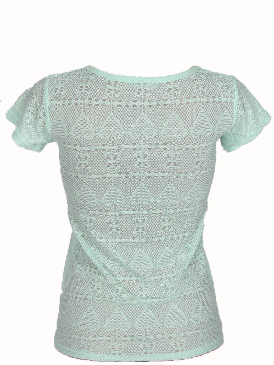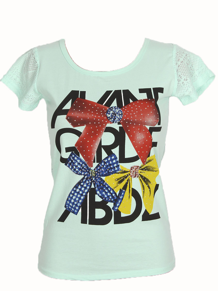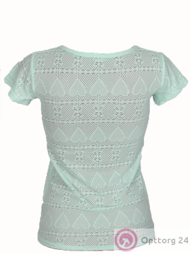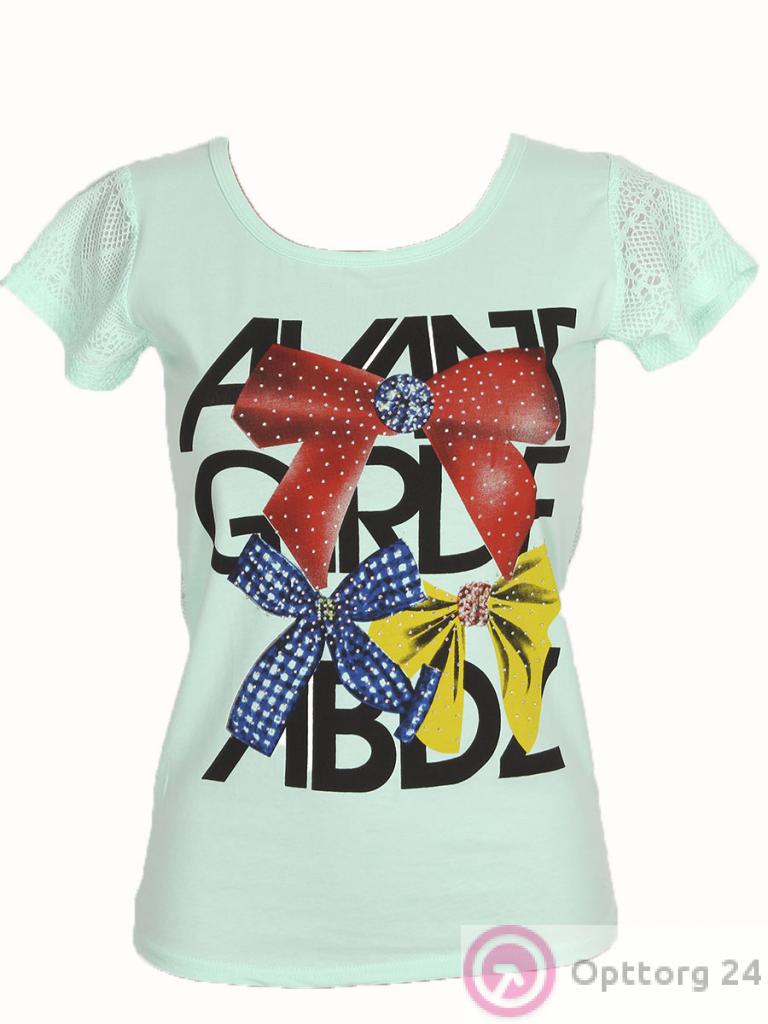 Футболка для женшин модель голубого цвета с красочным принтом на передней части изделия. оптом