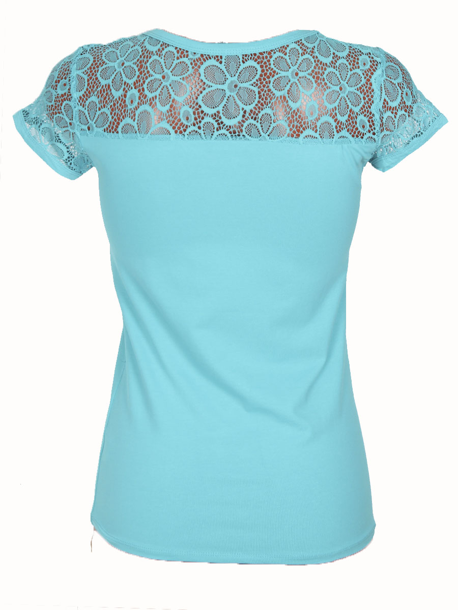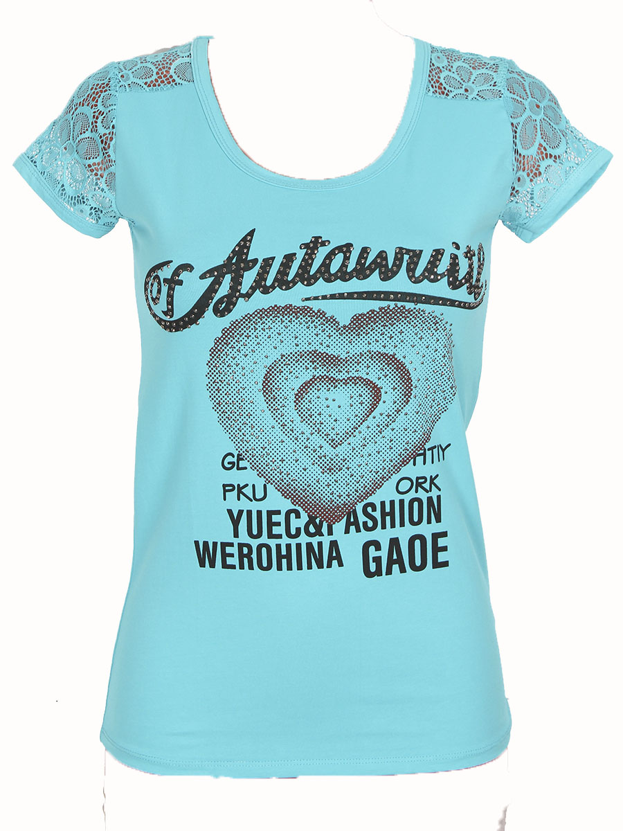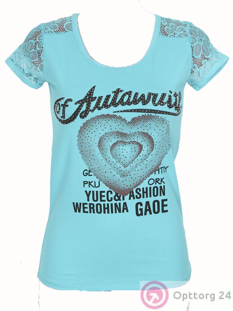 Футболка женская голубого с принтом на передней части изделия и сеткой в области спины.