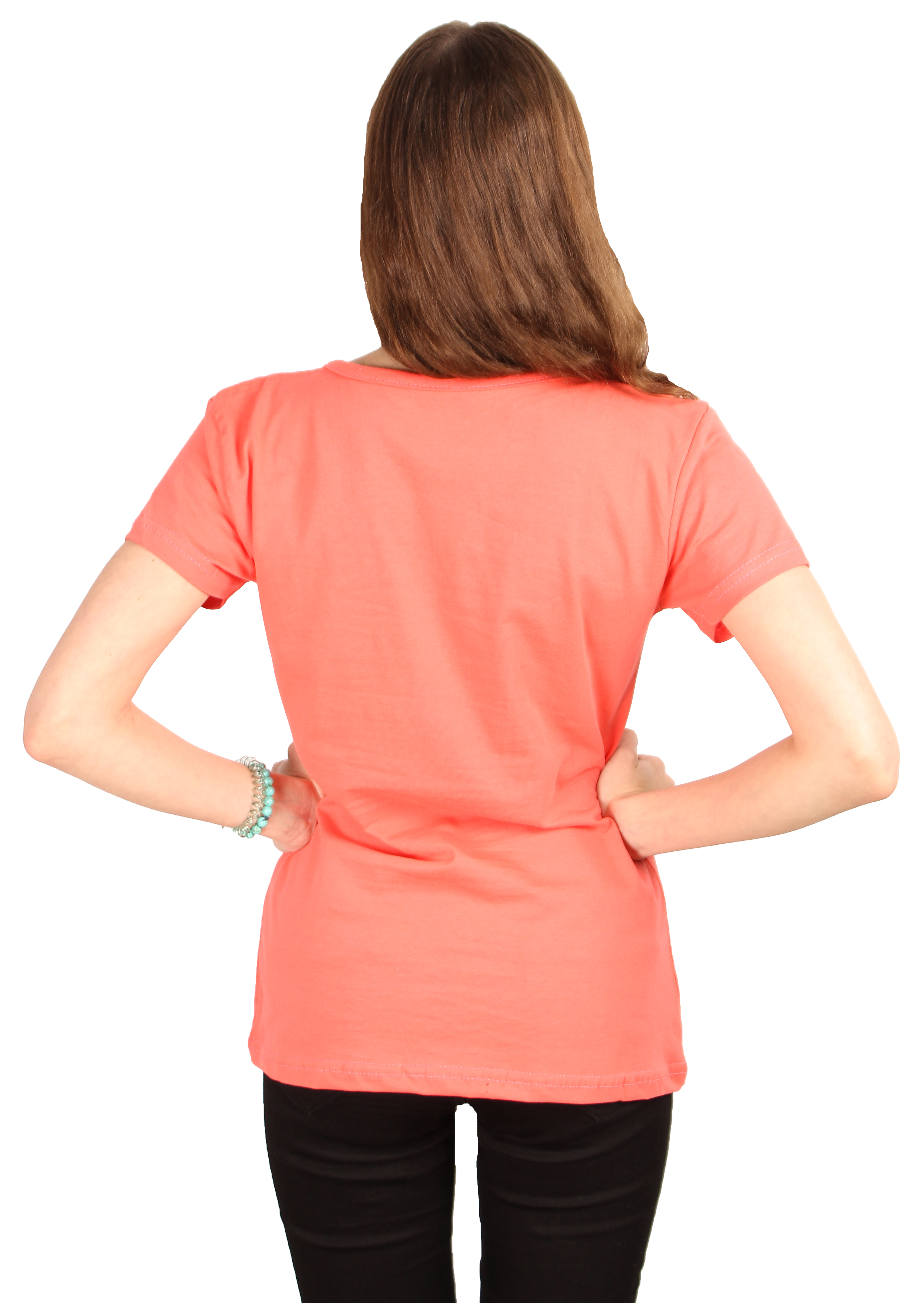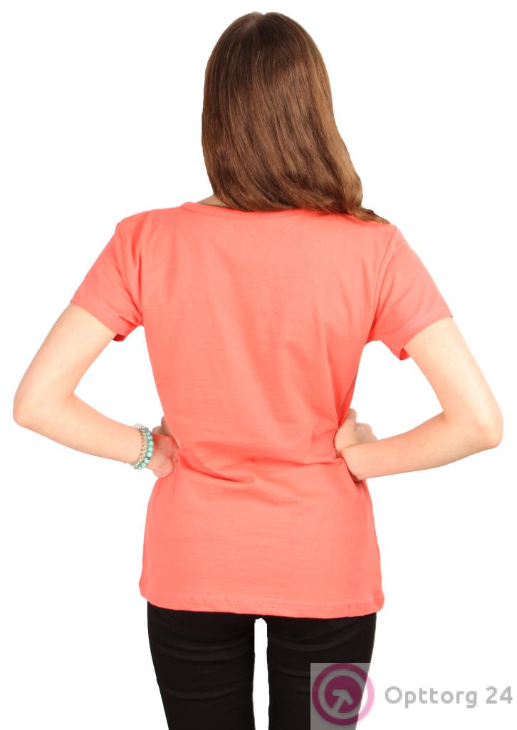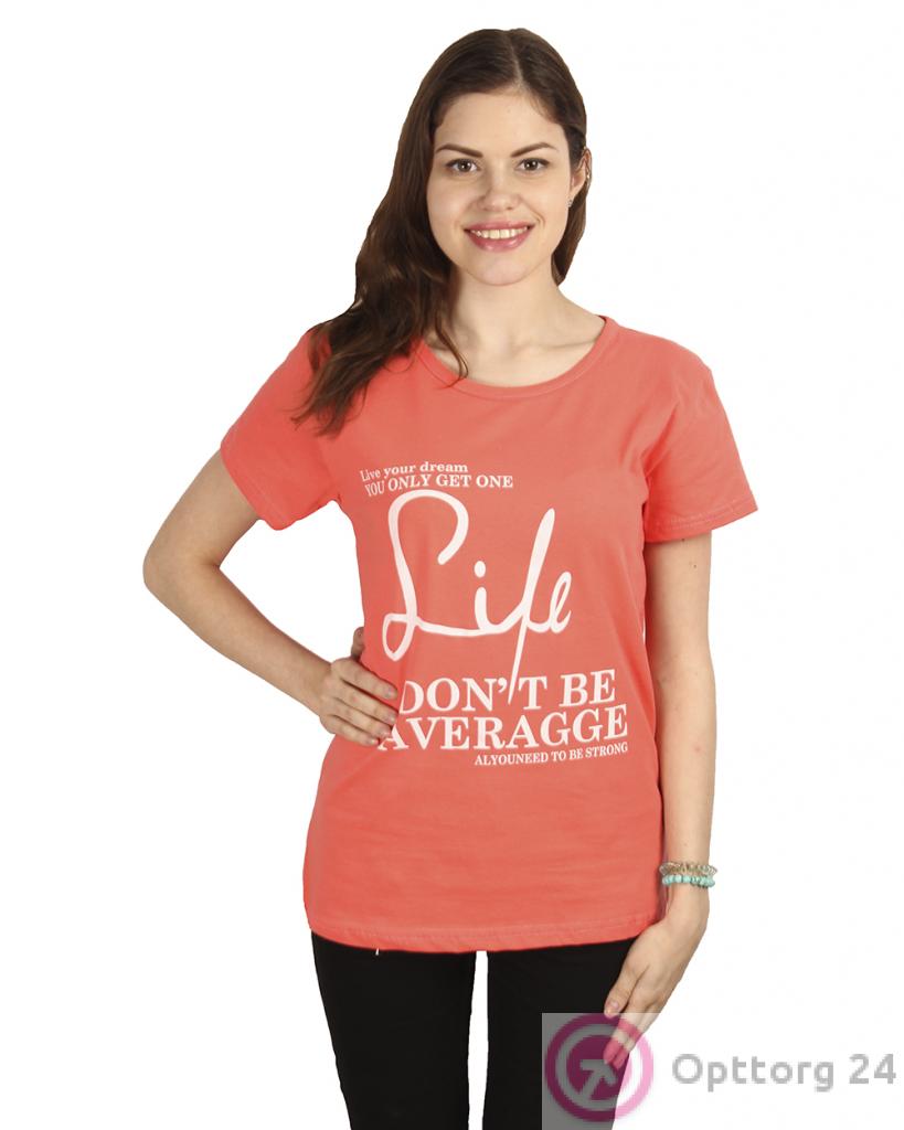 Женская футболка красного цвета с коротким рукавом и принтом на передней части.