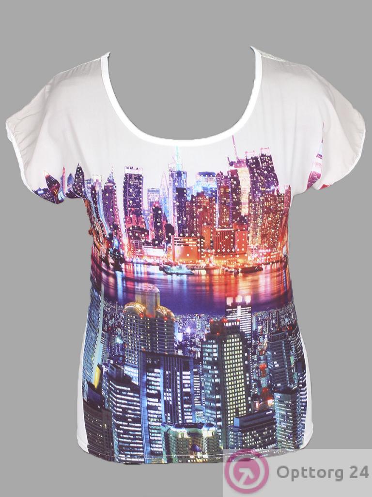 Футболка женская белого цвета с принтом в виде города на передней части изделия.