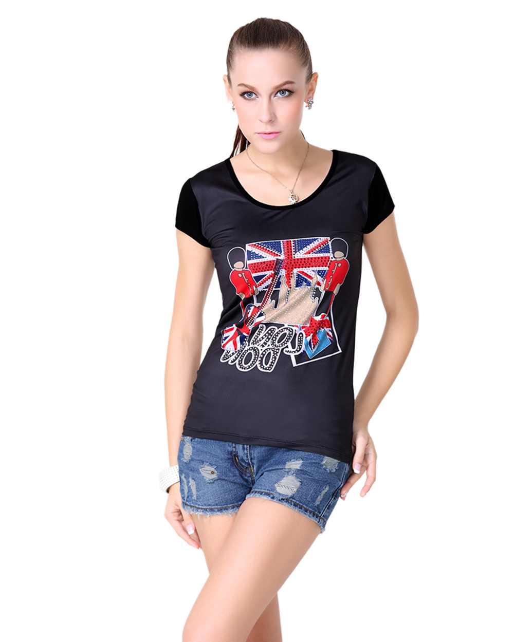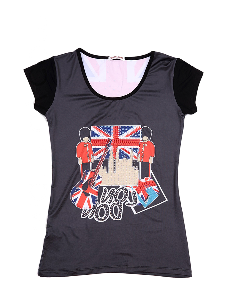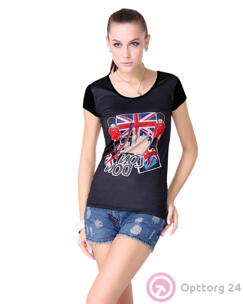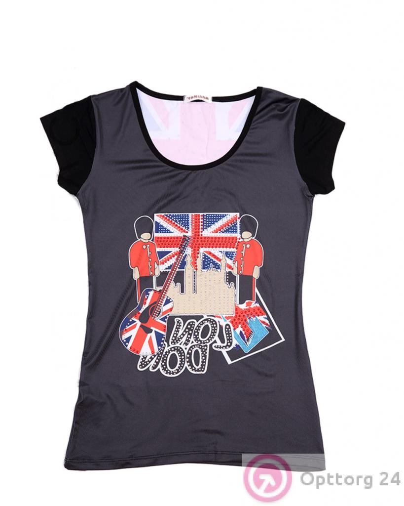 Стильная женская футболка из качественного коттона черного цвета. Спереди большой красочный принт с флагом Великобритании и надписью London.