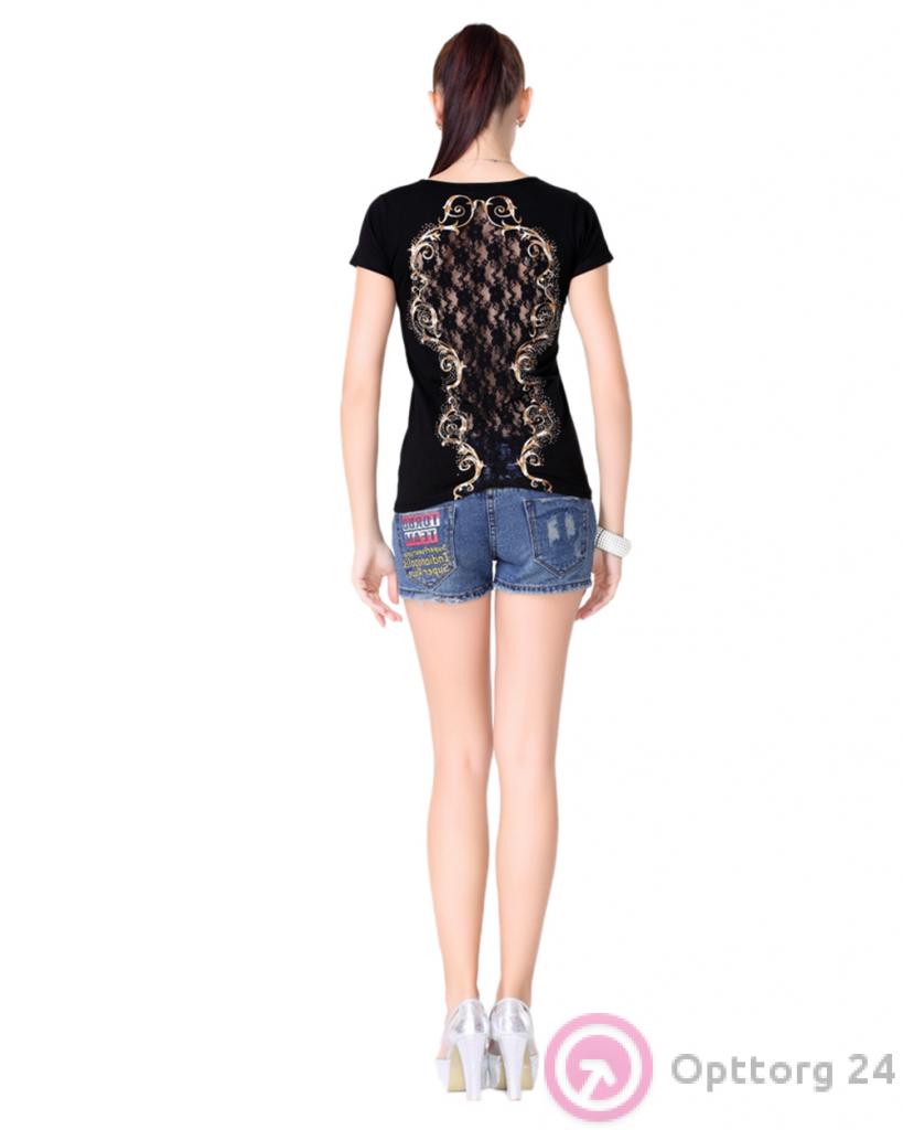 Стильная футболка черного цвета, выполнена из очень качественного материала. Красивая ажурная вставка на спине с позолоченой обводкой очень оригинально смотрится. Небольшой V-образный вырез. Отлично сочитается с юбками, шртами и брюками.