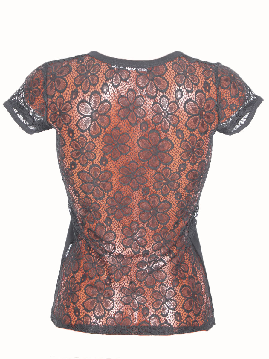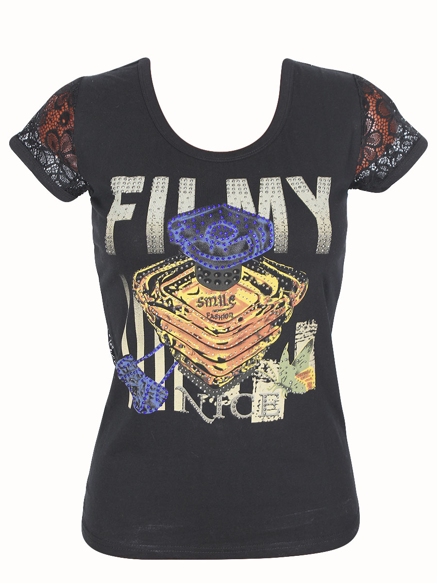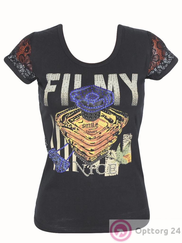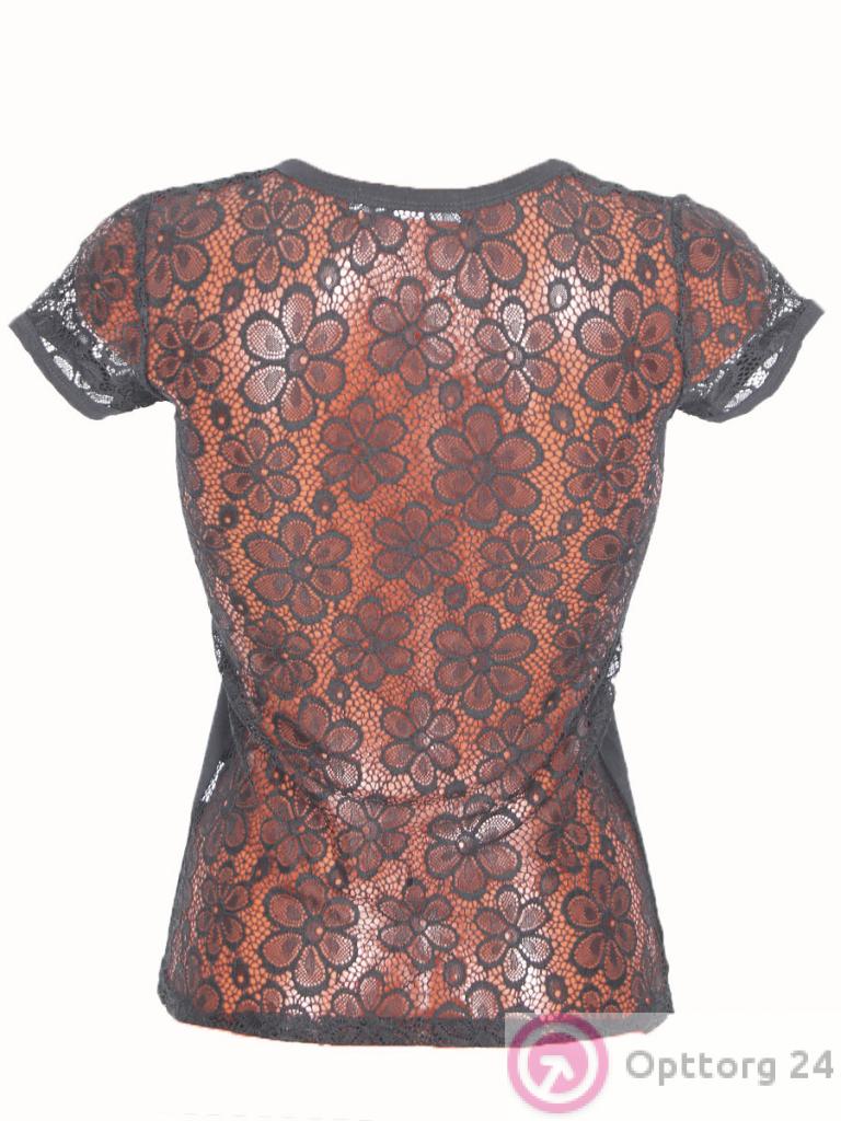 Футболка женская черного цвета с принтом и сеткой в области спины оптом