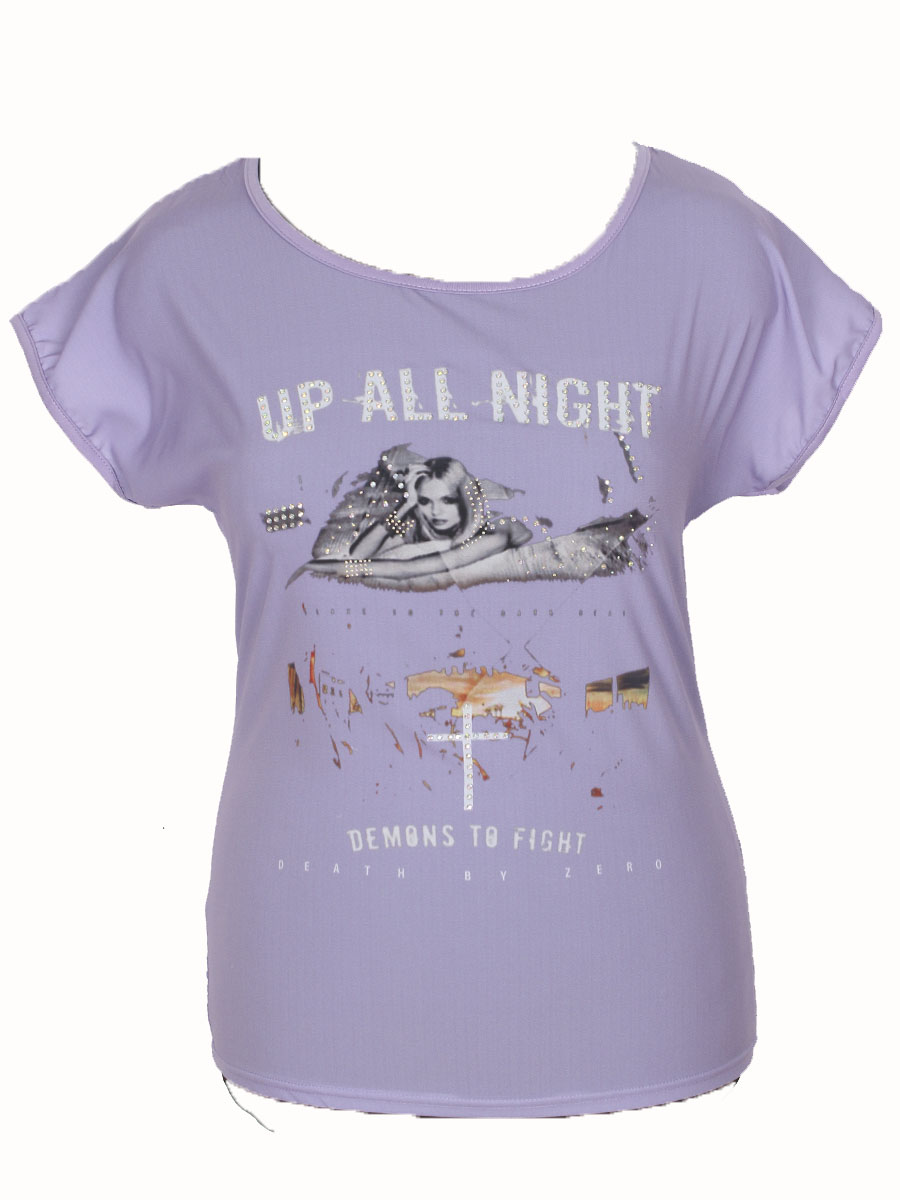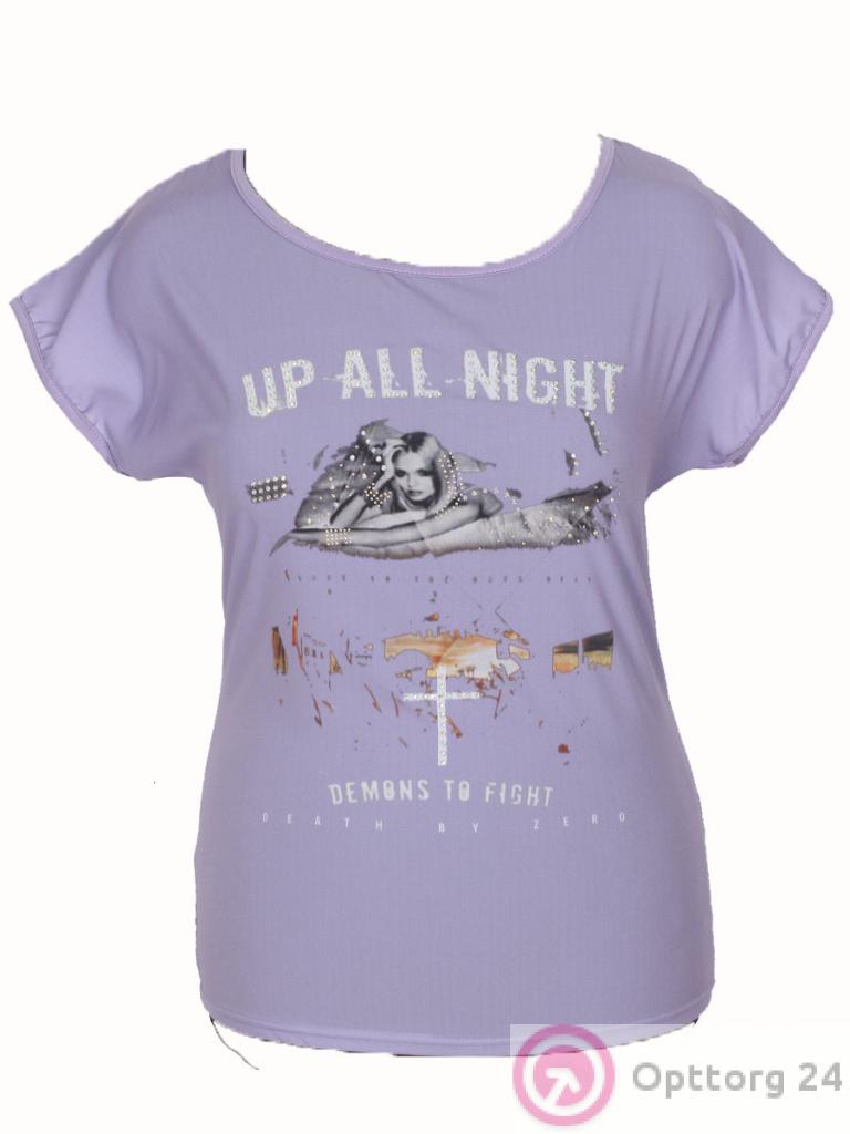 Футболка женская фиолетового цвета с небольшим принтом на передней части изделия. оптом