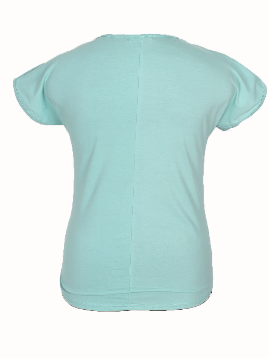 Футболка женская нежно-голубого цвета с принтом на передней части изделия украшенным аппликацией.