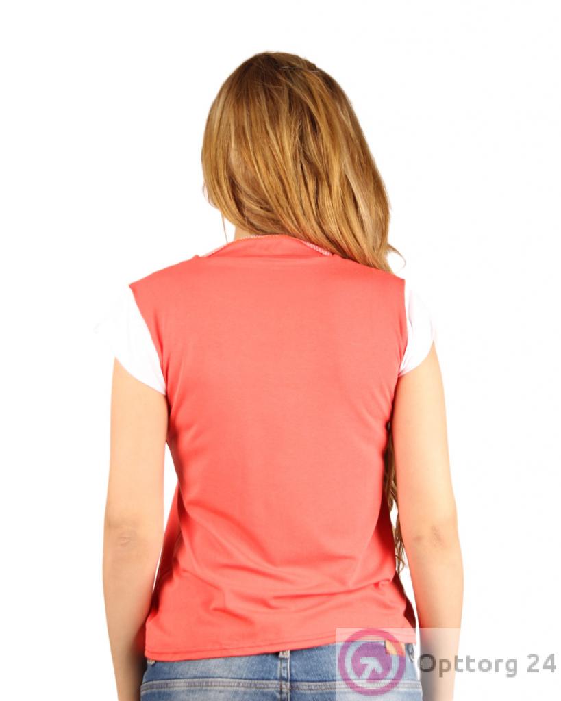 Оригинальная женская футболка оранжевая с завязками у горловины. Безупречное качество пошива и ткани. Футболка прямого покроя, с овальным неглубоким вырезом горловины, короткими рукавами и вставками белого цвета.