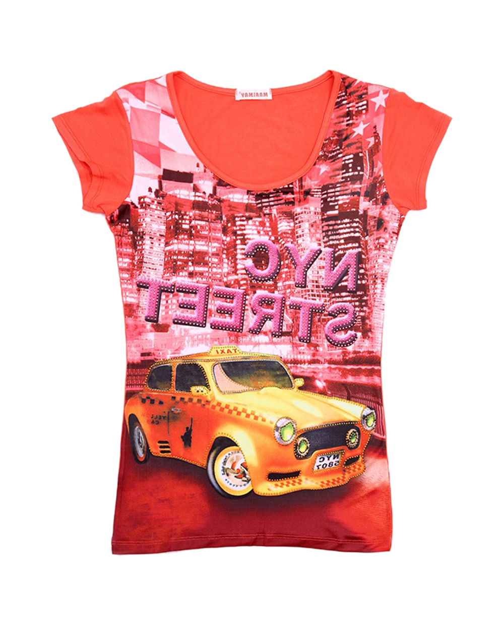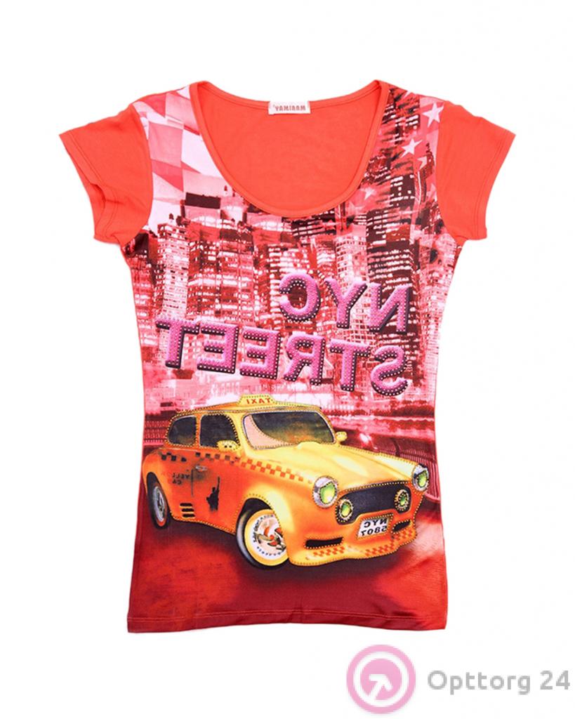 Модная и комфортная женская футболка персикового цвета с актуальным в этом сезоне принтом с изображением такси Нью-Йорка. Модель с округлім вырезом, средней длинны. Хорошо садится по фигуре. Изготовлена из натуральной ткани.