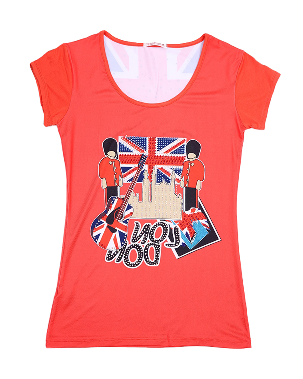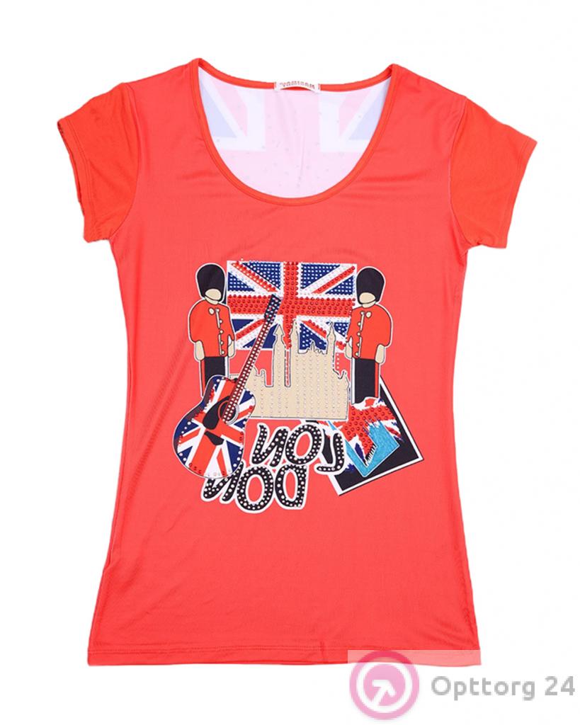Модная женская футболка персикового цвета с большим красочным принтом с флагом Великобритании и надписью London.