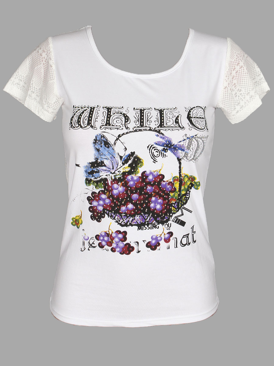 Женская футболка белого цвета с изображением на передней части изделия.