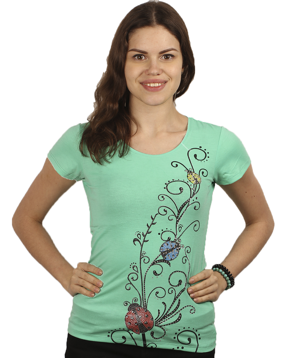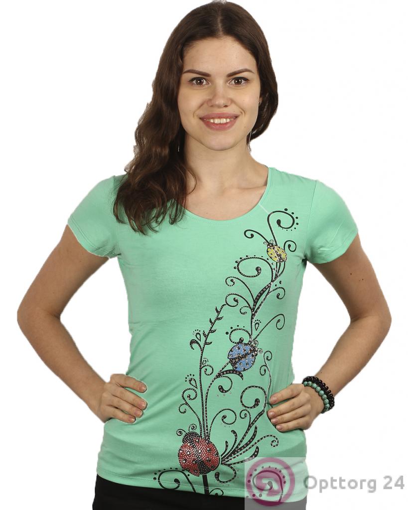 Женская футболка бирюзового цвета с аппликацией в виде божьей коровки.