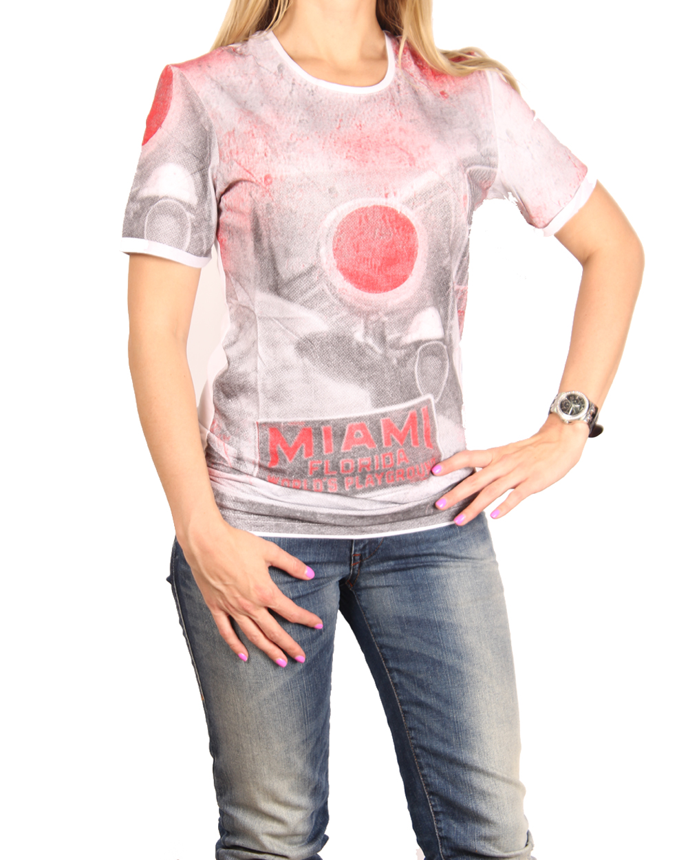 Качественная футболка с принтом серого цвета и красными кругами. Рукава и спина однотонные, белого цвета. Модель с округлой горловиной.