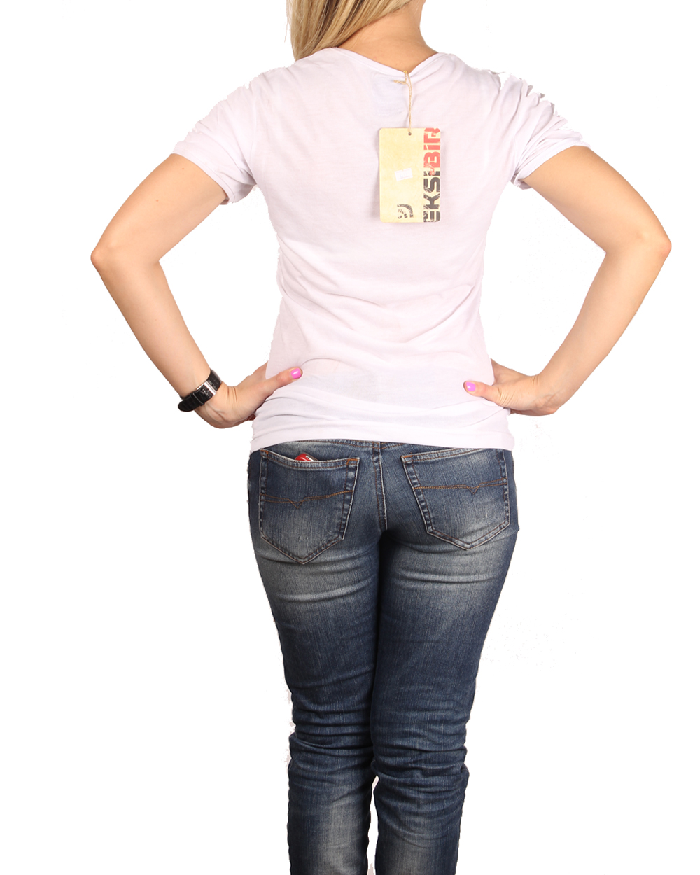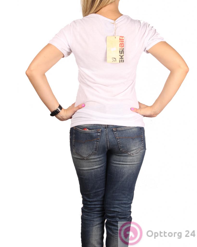 Женская футболка из качественного коттона, облегающий силуэт с округым вырезом горловины. Модель белого цвета с большым принтом спереди. Состав хлопок 95%, 5 % эластан.