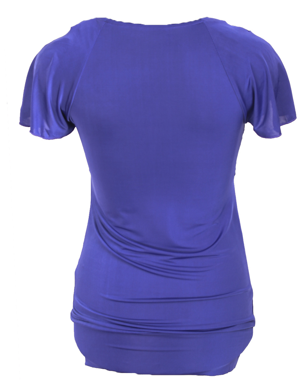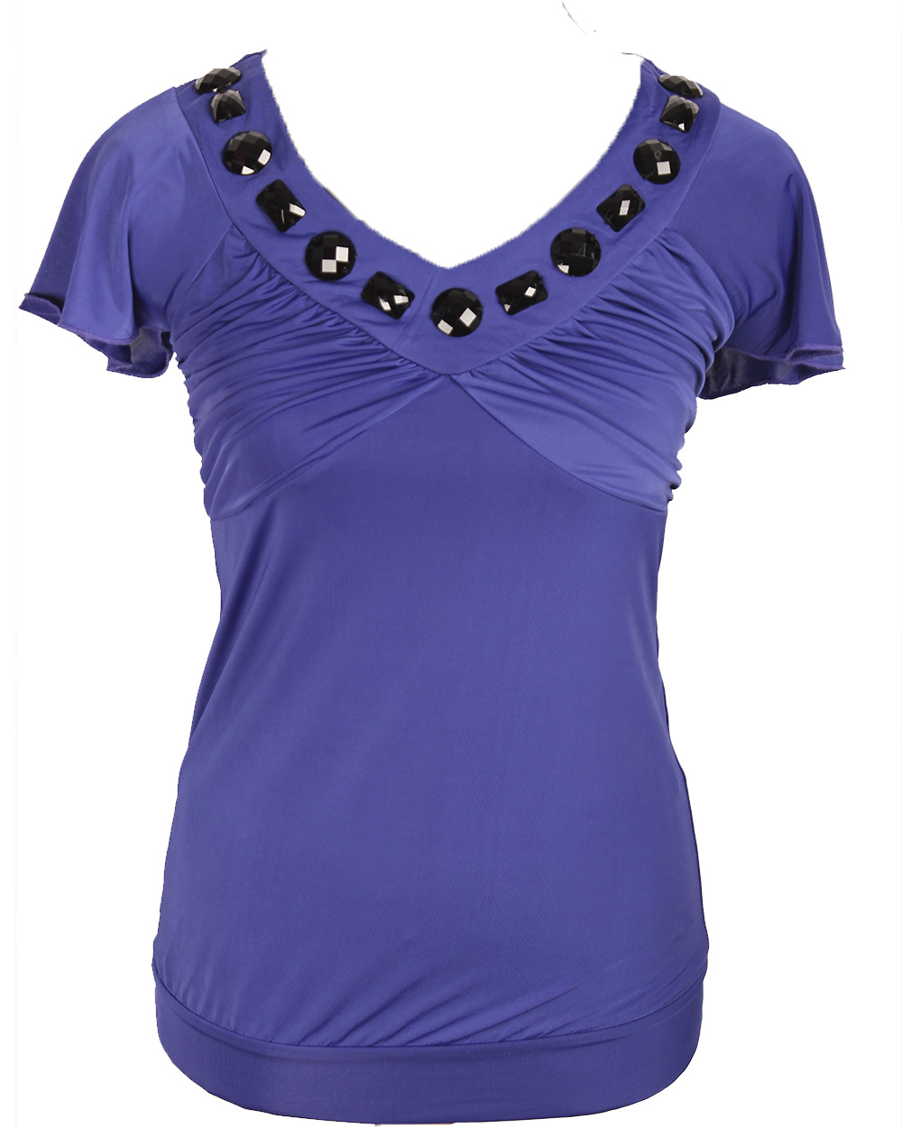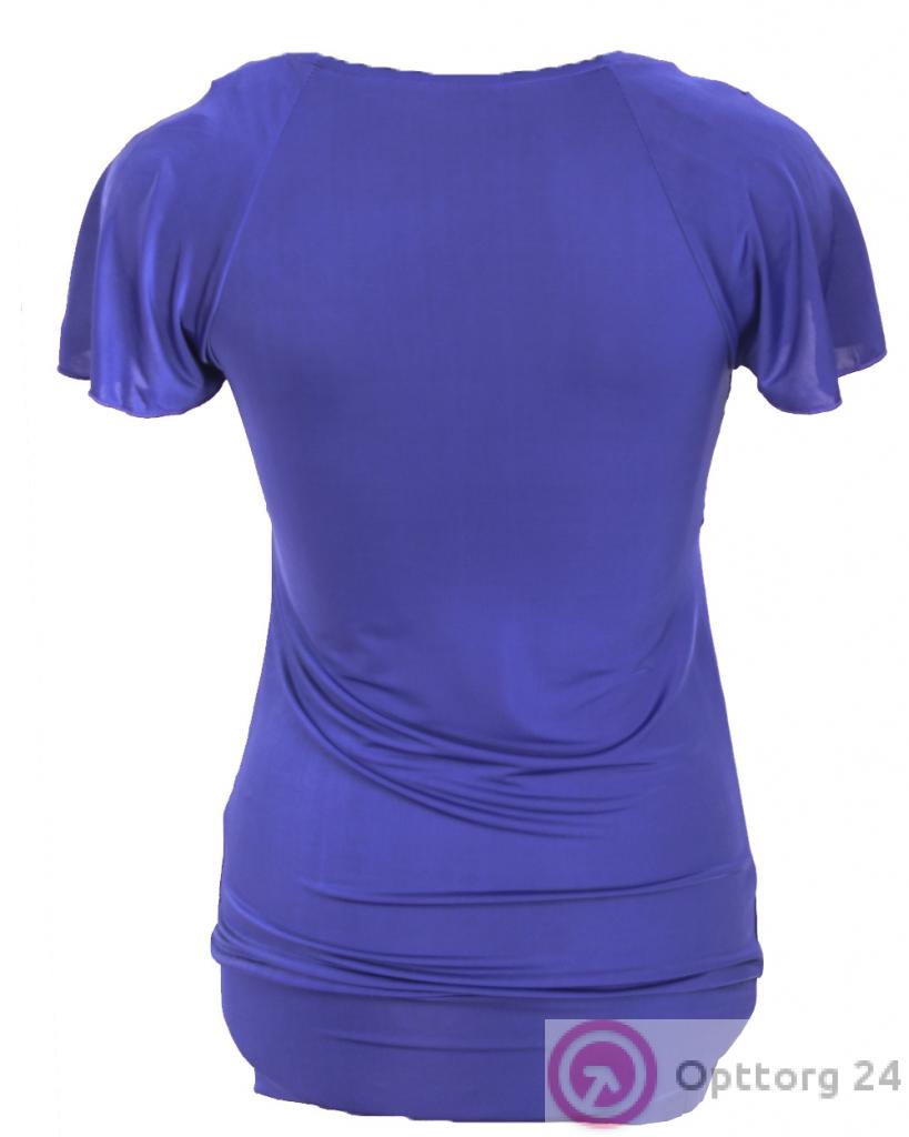 Футболка женская синего цвета на воротнике расположено украшение в виде камней разного размера.