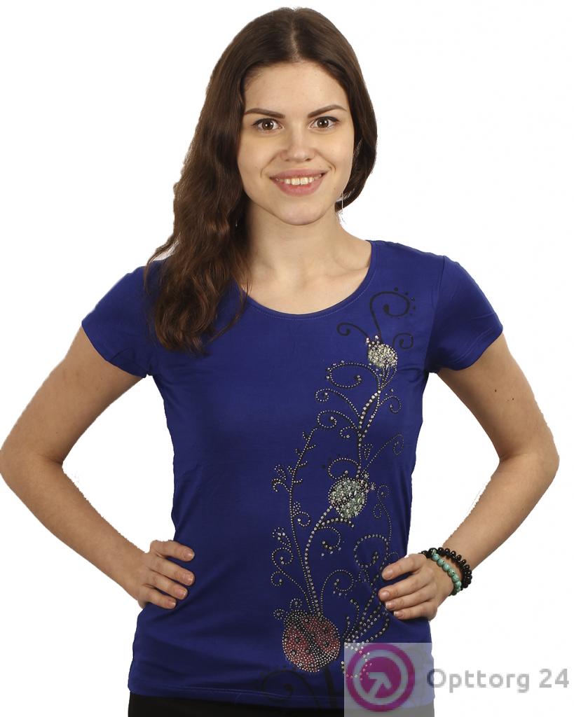 Футболка женская синего цвета с принтом в виде цветка. оптом