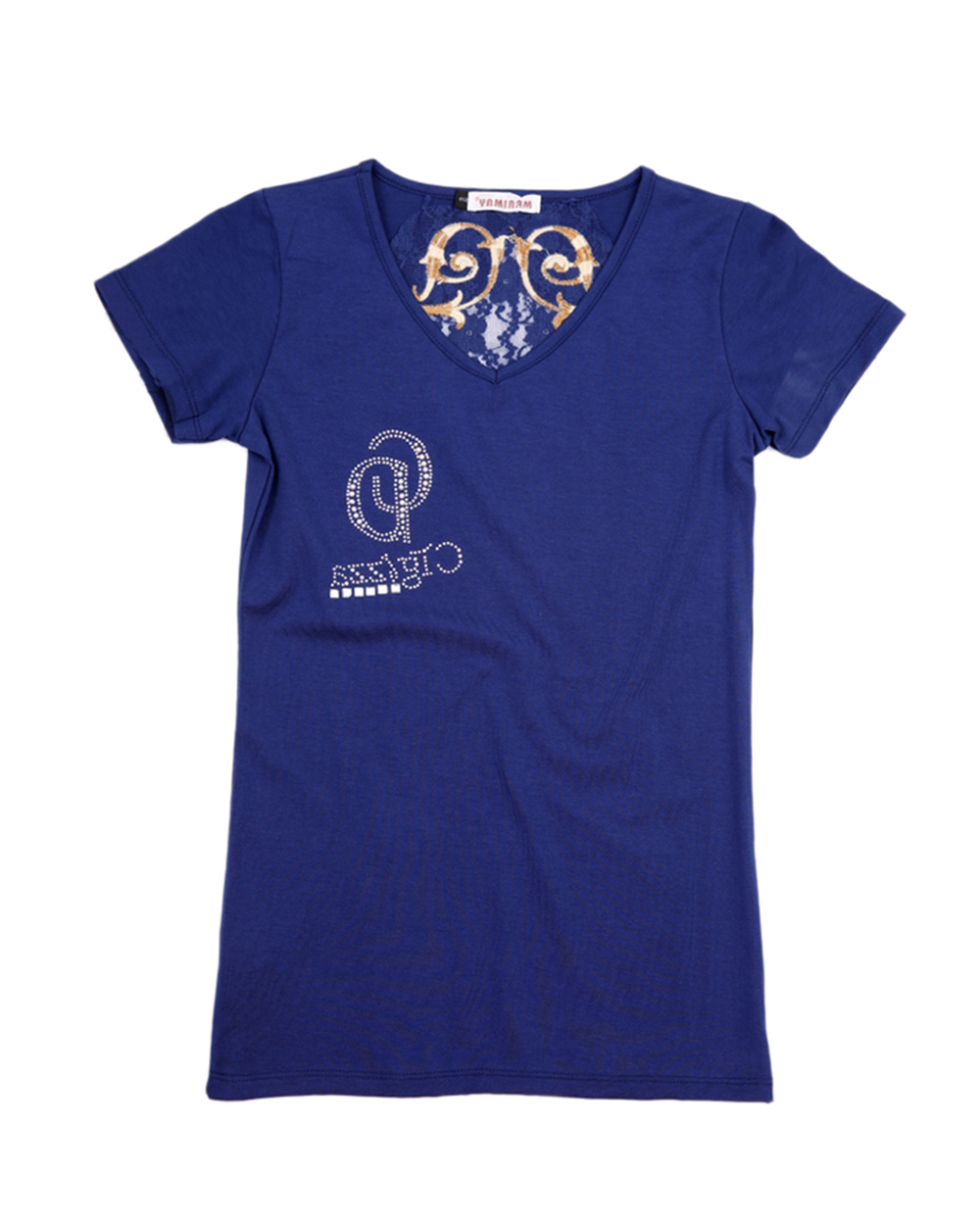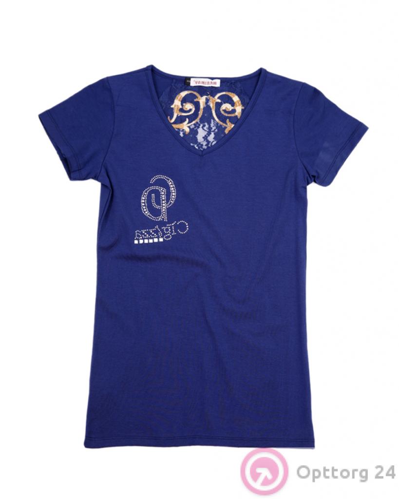 Футболка женская темно-синего цвета с ажурной вставкой оптом