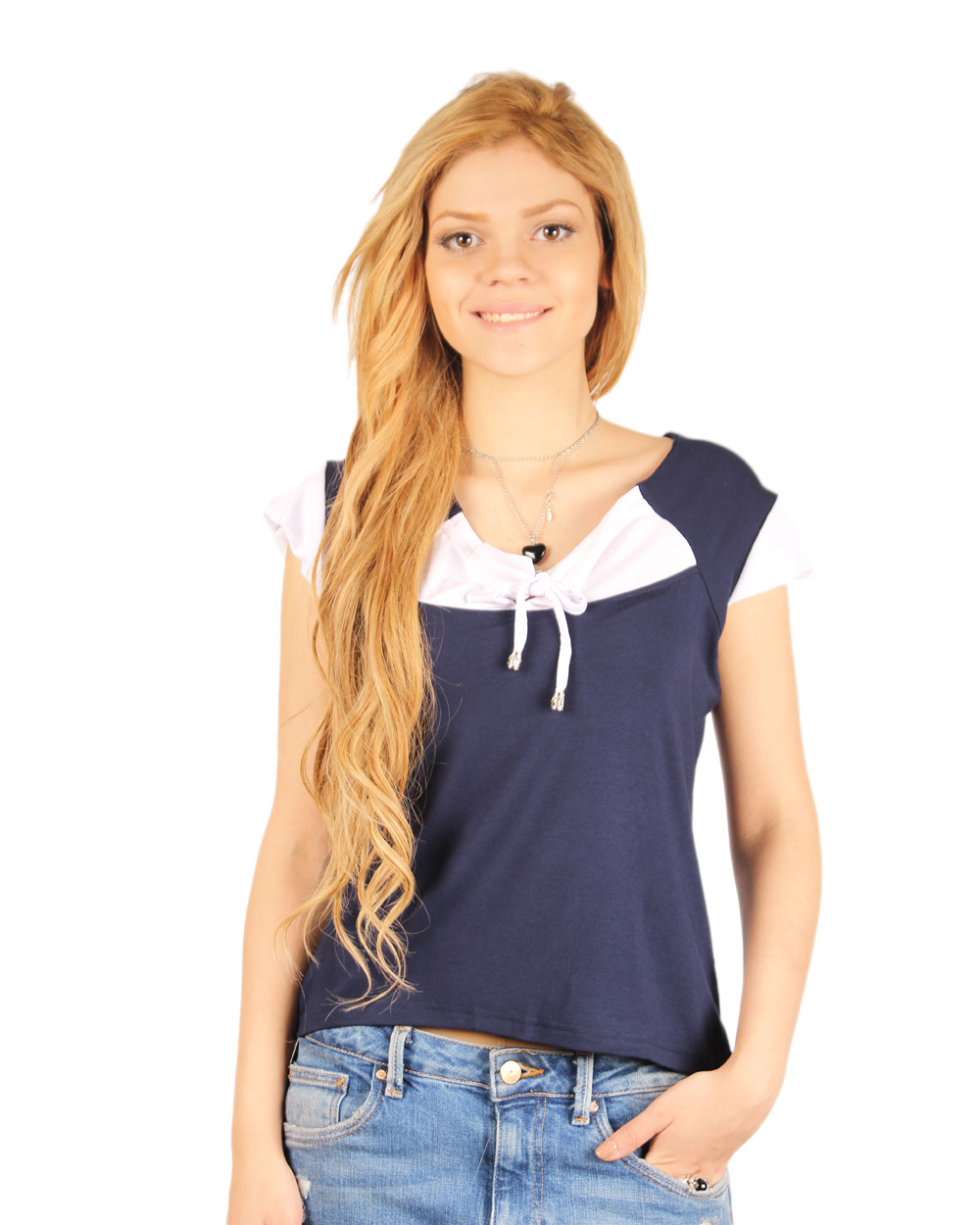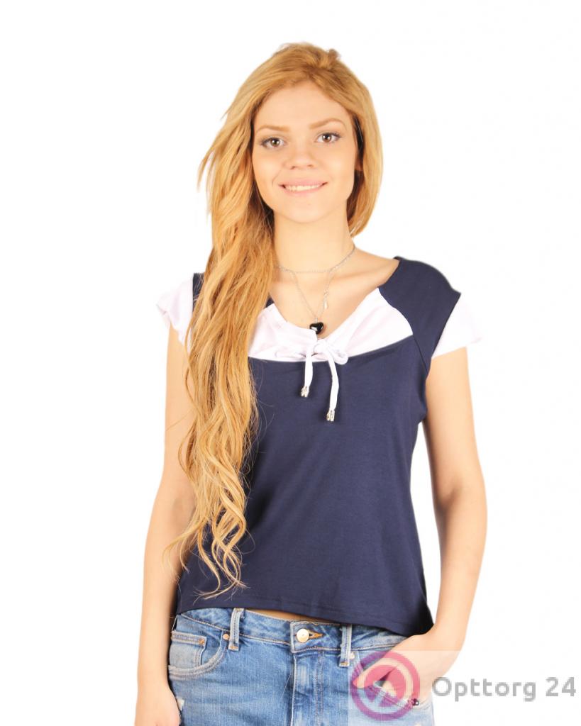 Красивая женская футболка темно-синяя с завязками у горловины. Безупречное качество пошива и ткани. Футболка прямого покроя, с овальным неглубоким вырезом горловины, короткими рукавами и вставками белого цвета.