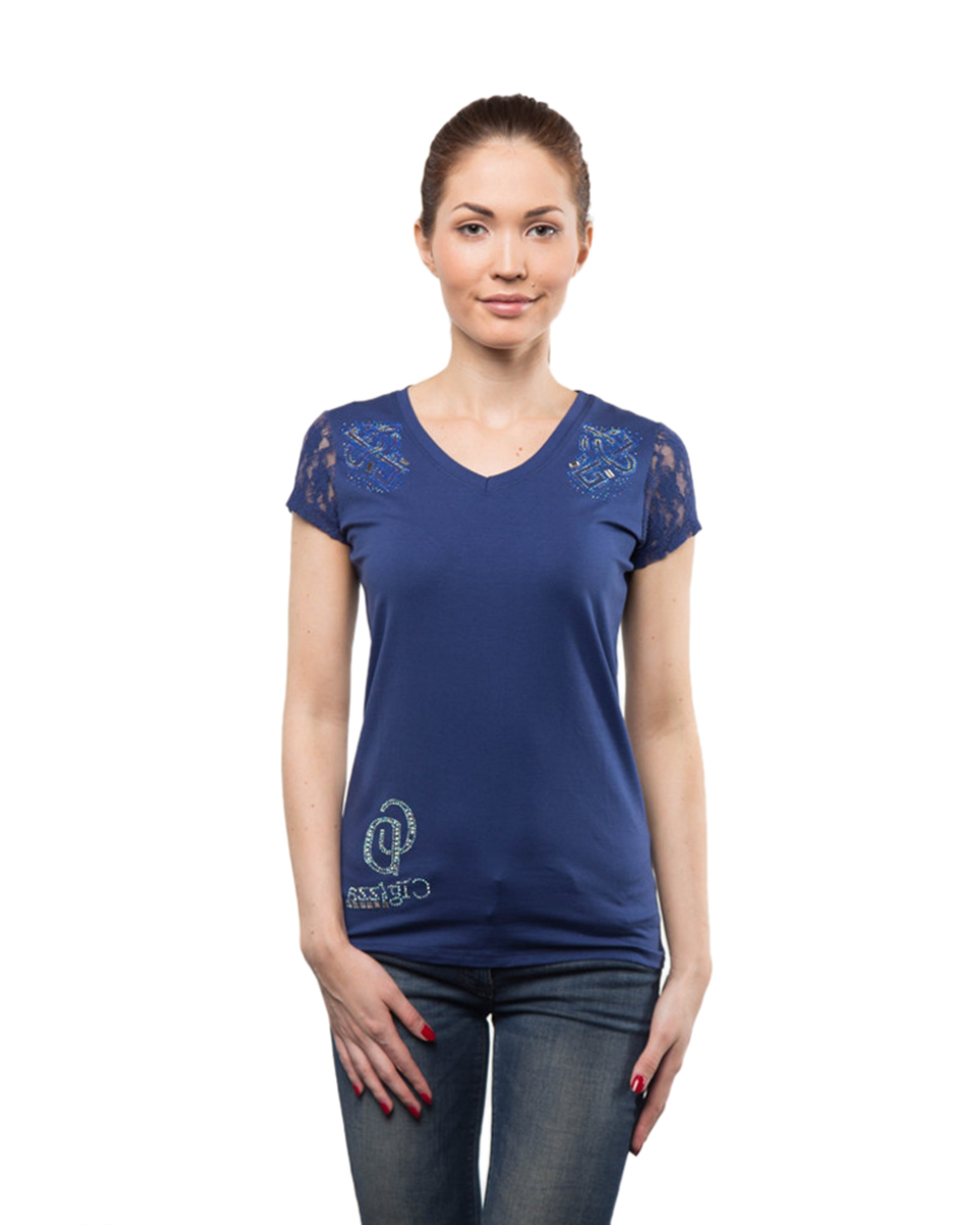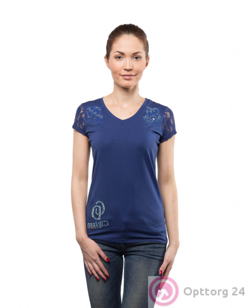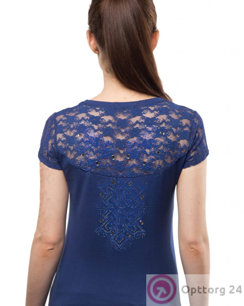 Футболка женская темно-синяя с ажурными рукавами оптом