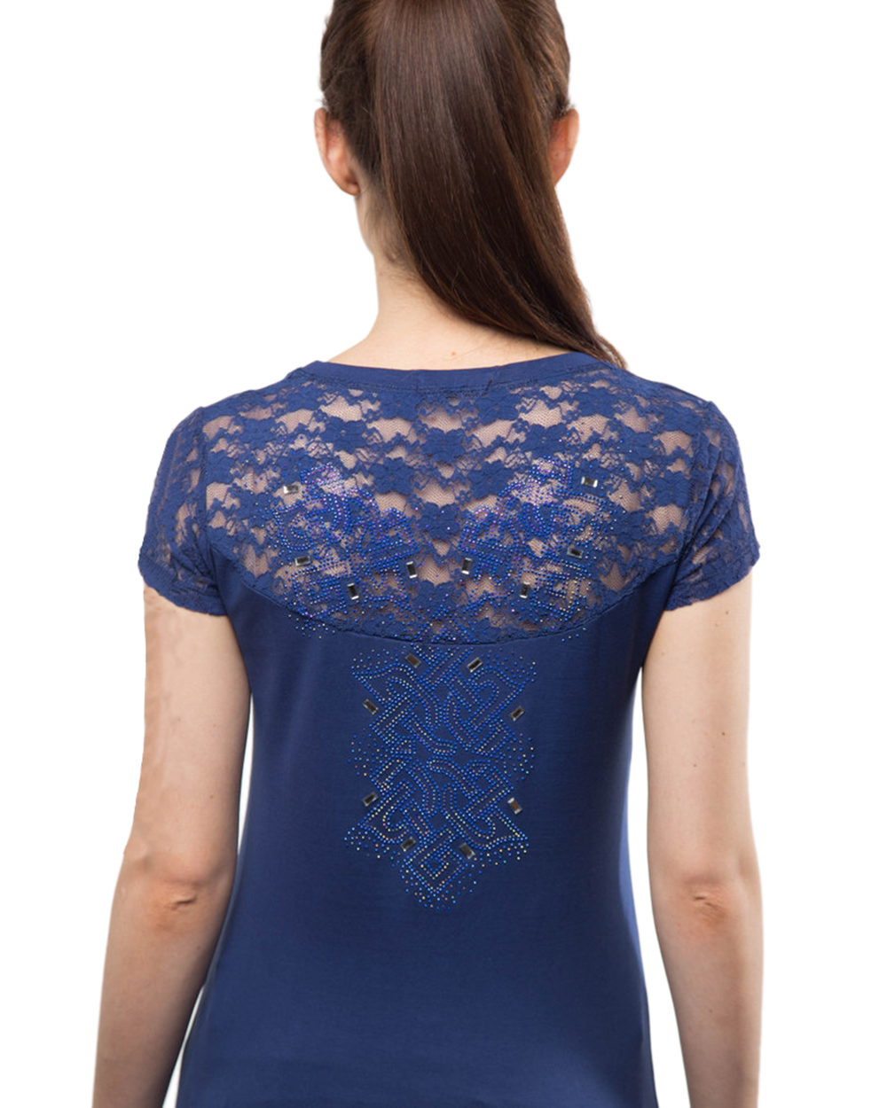Стильная и оригинальная футболка из хлопка. Модель выполнена в темно-синем цвете. Рукава и верхняя часть спинки сделаны из ажурной ткани. Спереди и сзади красивые узоры, выложенные из стразиков.