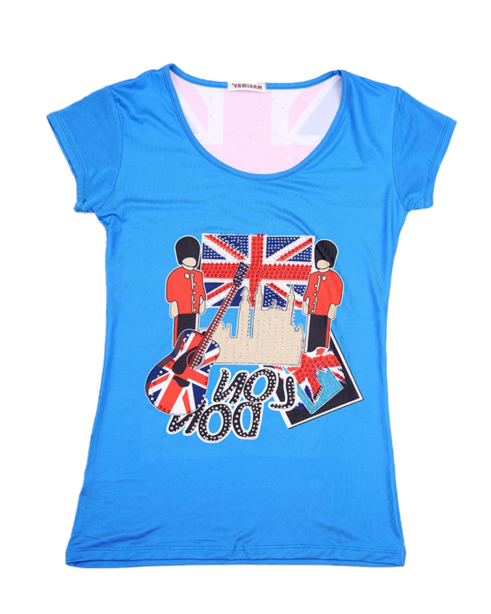 Оригинальная футболка отличного качества синего цвета с большим красочным принтом с флагом Великобритании и надписью London. Горловинка овальная, прилегающий силуэт.