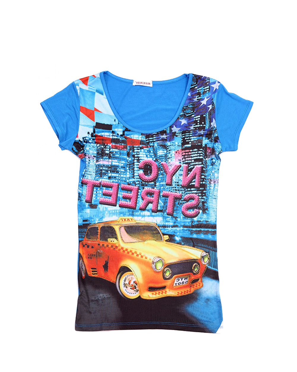 Красивая футболка из качественной ткани ярко синего цвета и большим принтом спереди. Принт с изображением нью-йоркской улицы. Модель имеет округлую горловину, отлично садится по фигуре. Отличный вариант для носки каждый день.