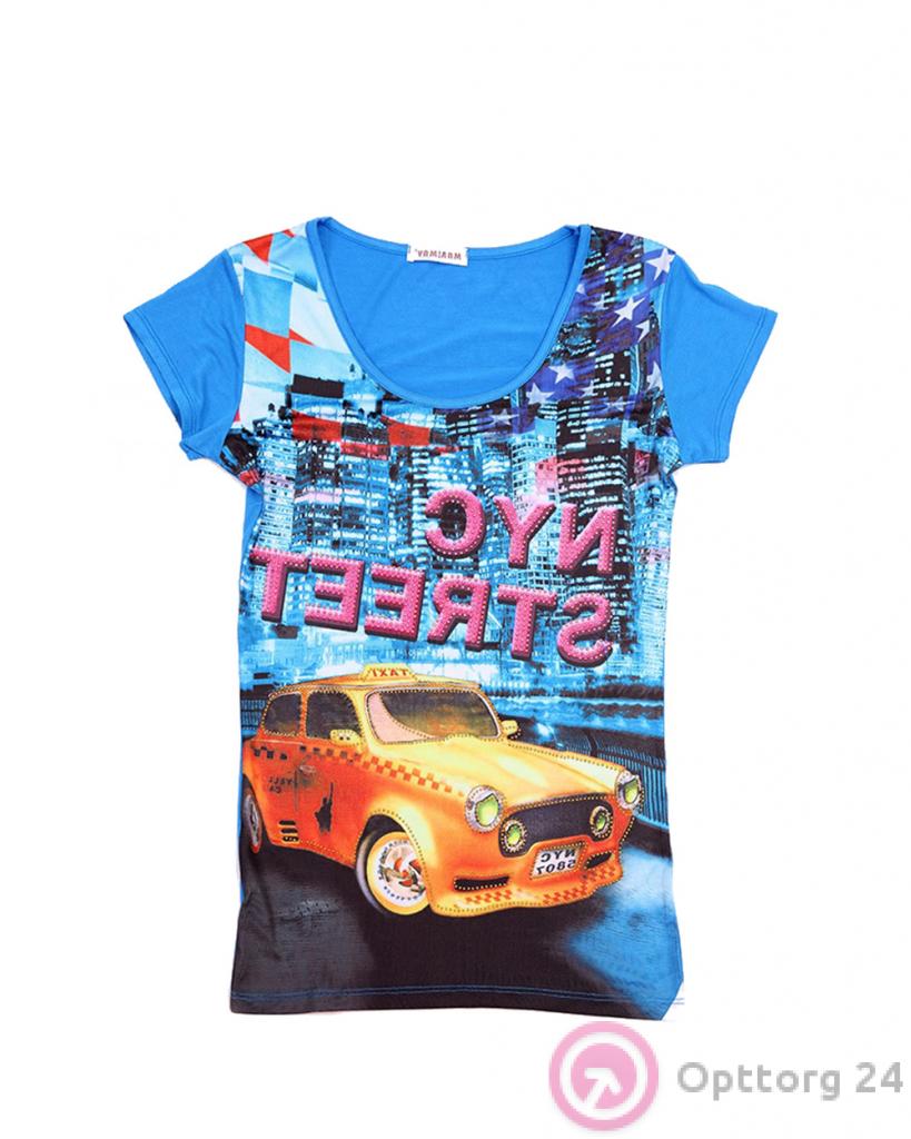 Футболка женская ярко синяя с принтом NYC STREET оптом