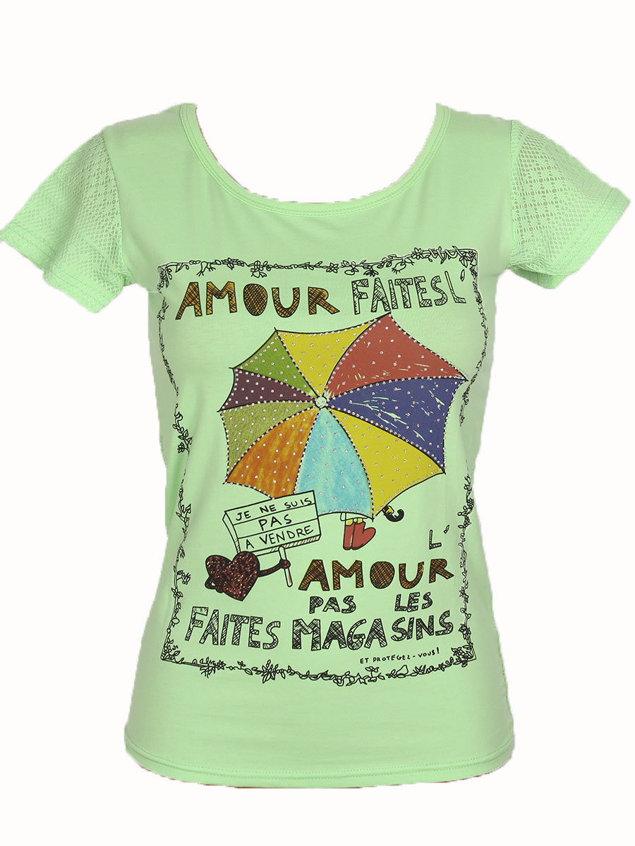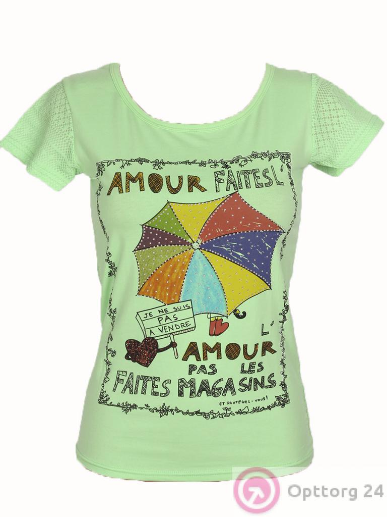 Футбока женская ярко-зеленого цвета с принтом в виде зонтиков.