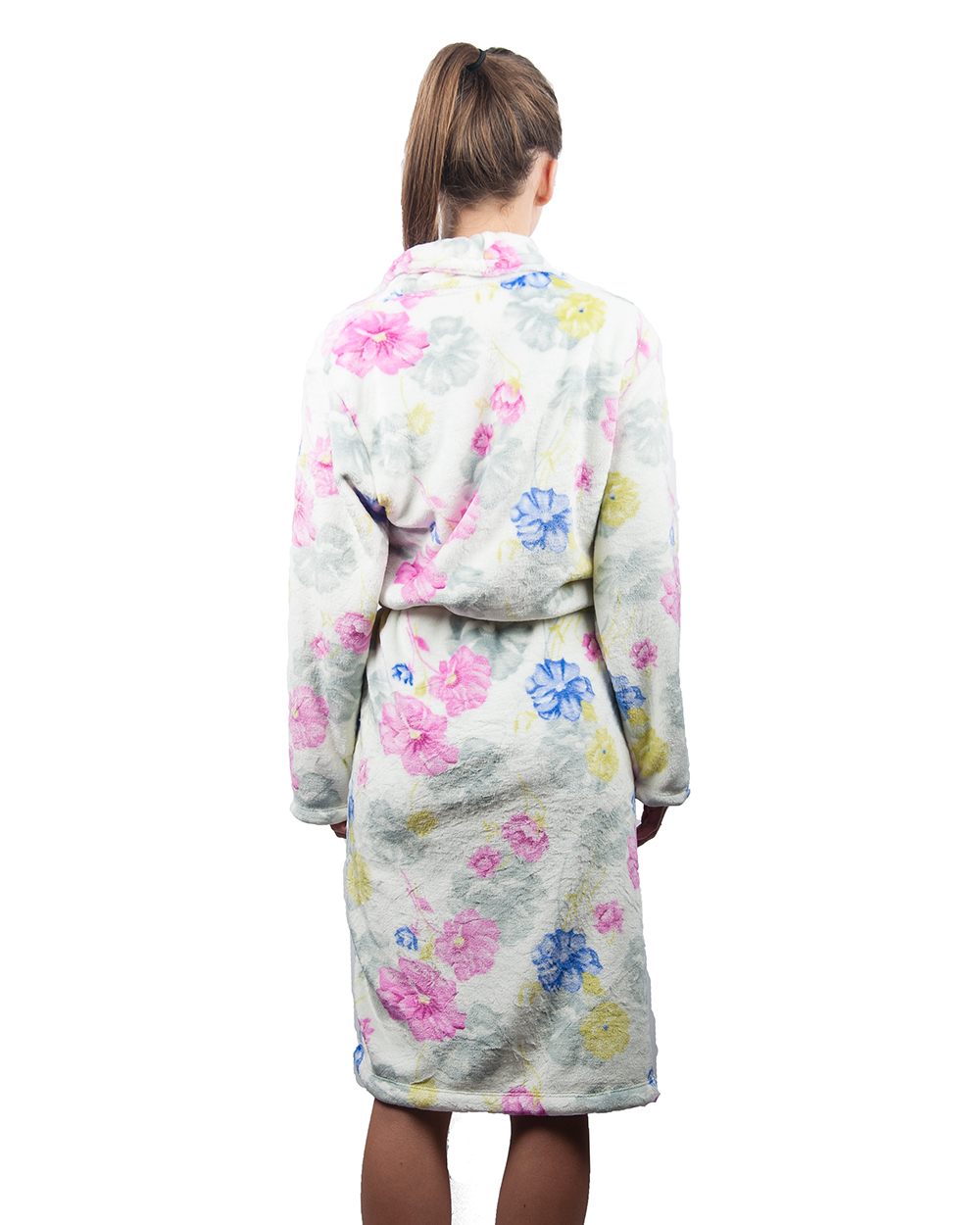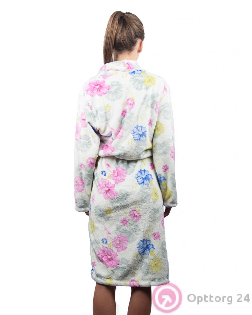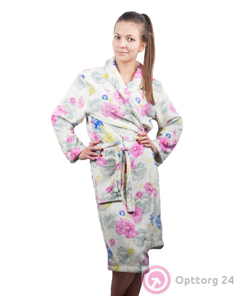 Халат женский из велсофта длинный белый с серыми цветами оптом