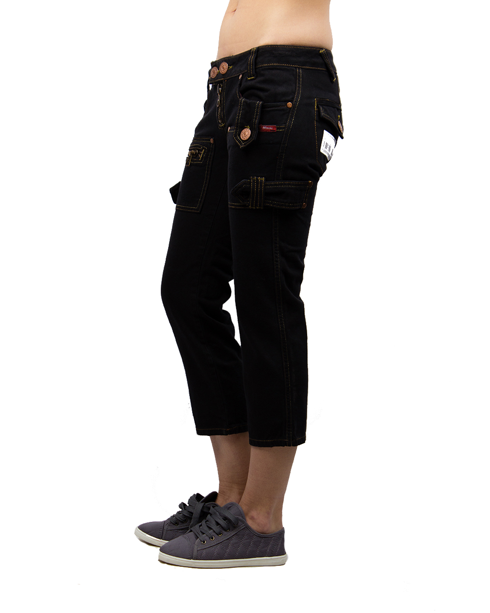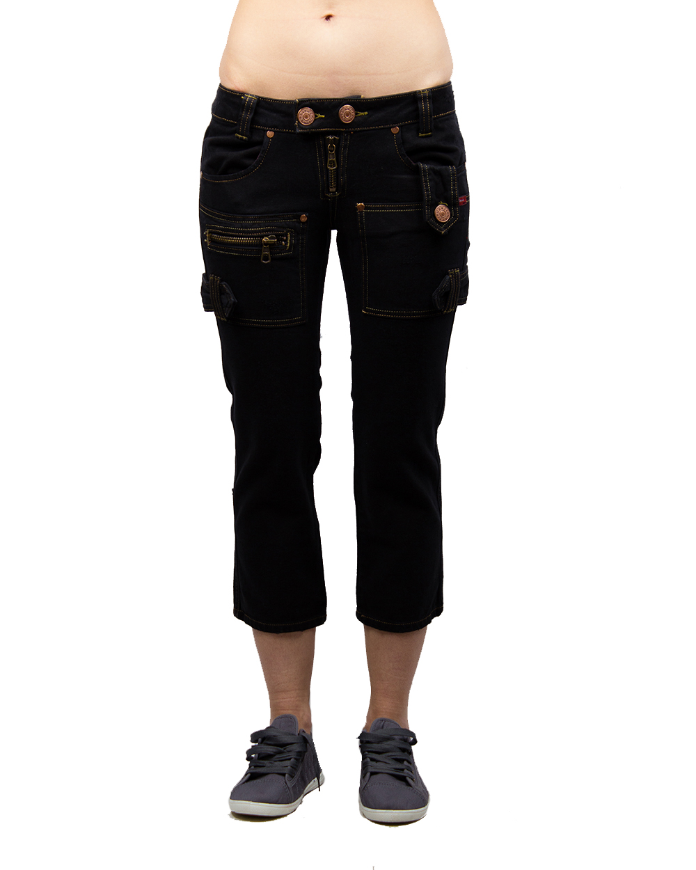 · Черные капри (артикул 201 20) выполнены из плотной эластичной ткани, украшены контрастной прострочкой, накладными карманами и яркими молниями. Оптимально смотрятся с кедами, футболками, рубашками (не приталенными), кепками, кроссовками.