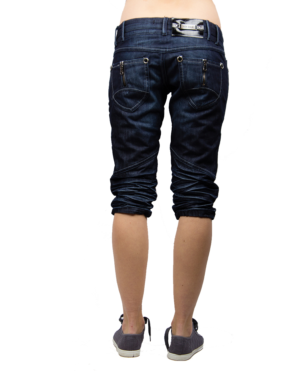 · Темно-синие капри с эффектом жатой ткани с молниями и декоративной отделкой представляют собой более лаконичный вариант, и могут сочетаться даже с женственными босоножками на плоской подошве, свободной блузой или туникой.