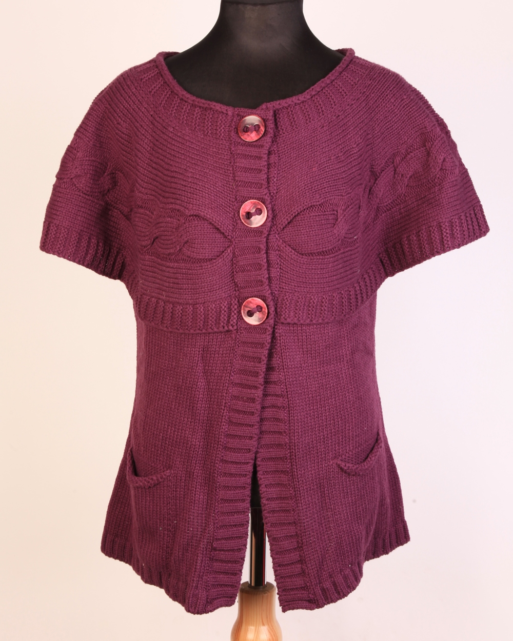 Этот удобный кардиган с укороченными рукавами не только является прекрасным воплощением терпкого бордо, но и уютно сочетает в себе несколько способов вязки, согревающей в самые ледяные дни.