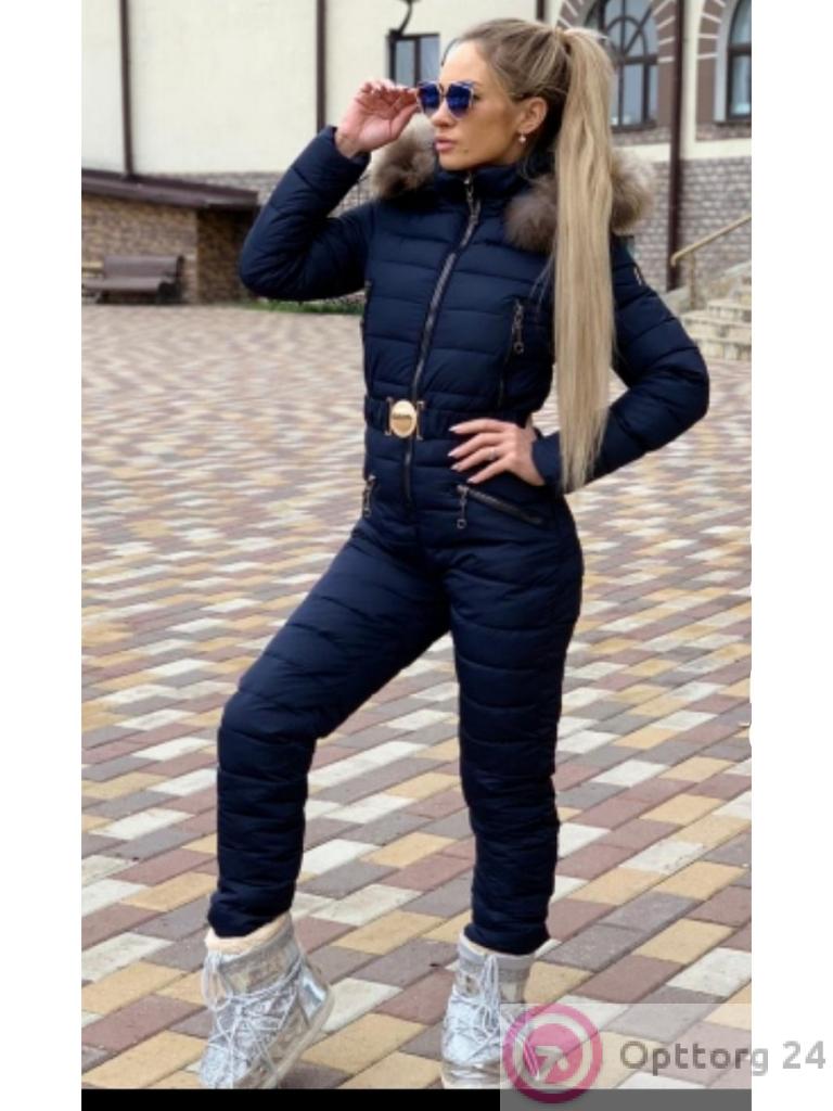 Синий комбинезон из синтепона с поясом и карманами понравится любой моднице. Капюшон с мехом. Теплый и удобный.