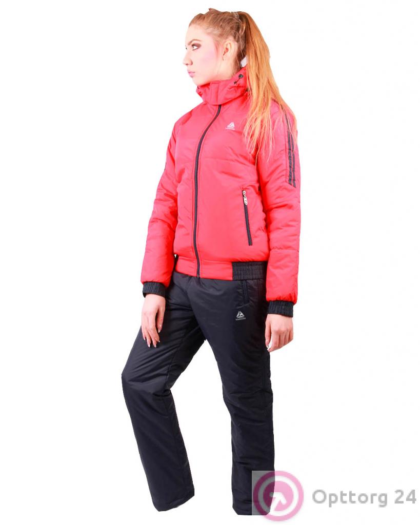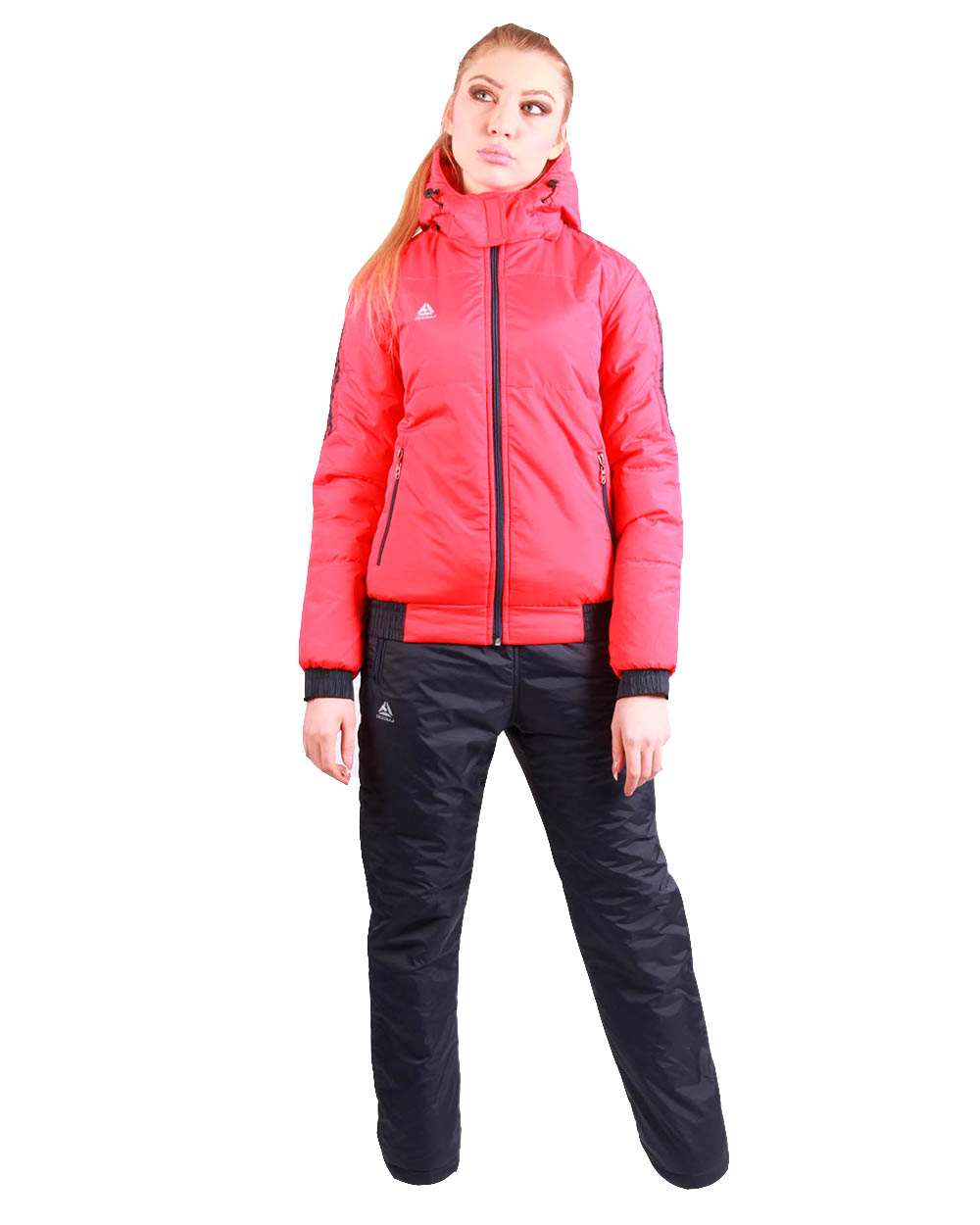 Горнолыжный костюм с красной курткой и черными брюками. Куртка имеет воротник-стойку и капюшон.