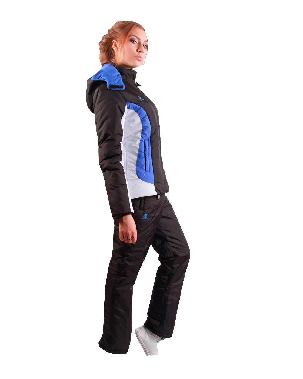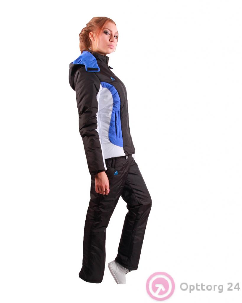 Горнолыжный женский костюм черного цвета с голубо-белыми вставками. Изделие имеет утеплитель синтепон 300 гр.