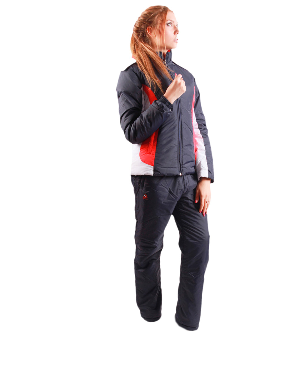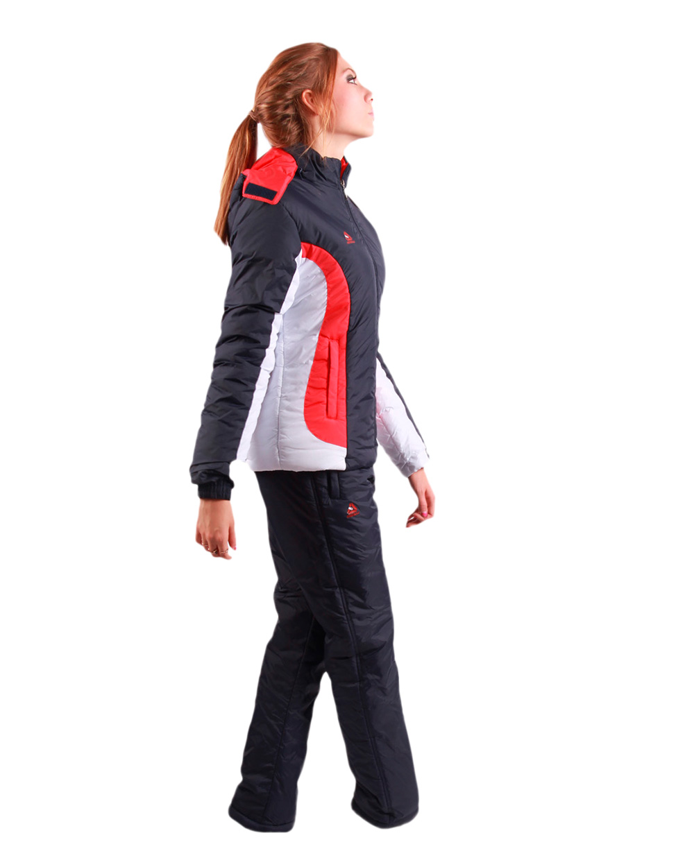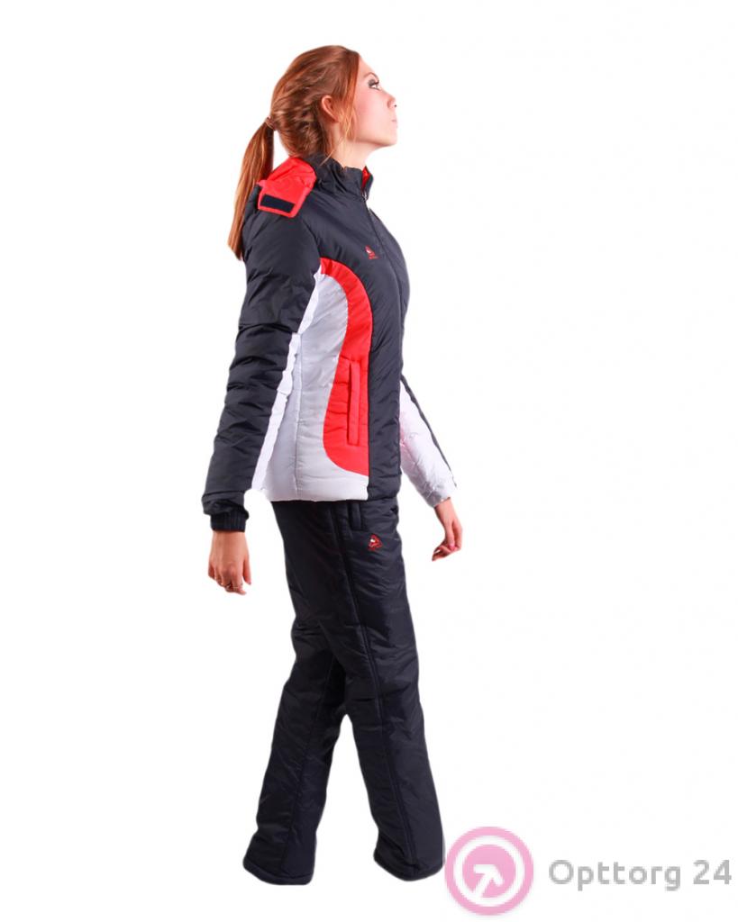 Женский горнолыжный костюм черного цвета с красно-белыми вставками по-боках. Куртка имеет капюшон и воротник-стойку.