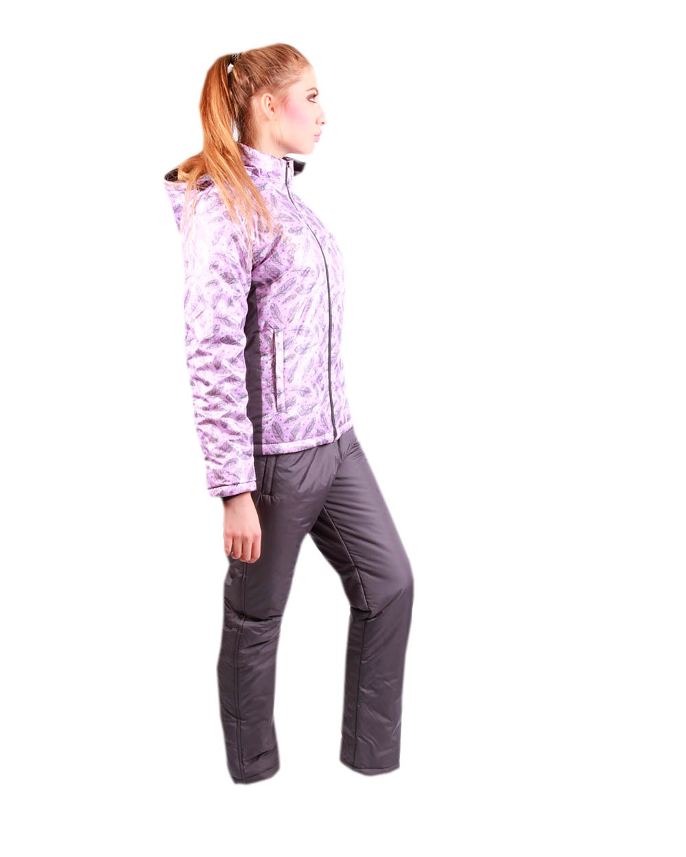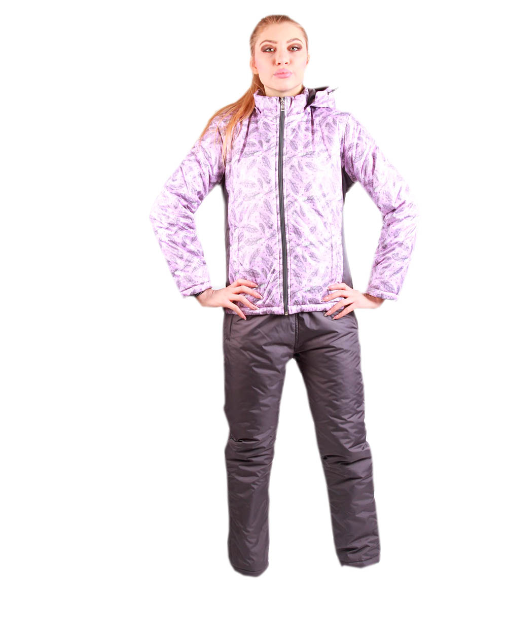 Горнолыжный костюм с курткой светло-сиреневого цвета и черными брюками. Костюм утеплен синтепонром 250 гр.