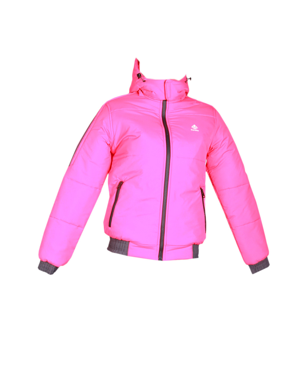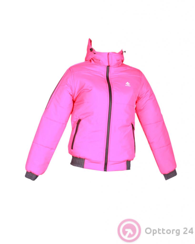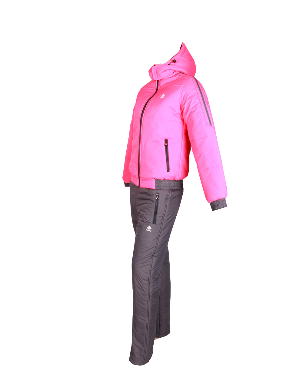 Горнолыжный костюм с курткой розового цвета и черными брюками. Застегивается на молнию, есть капюшон.