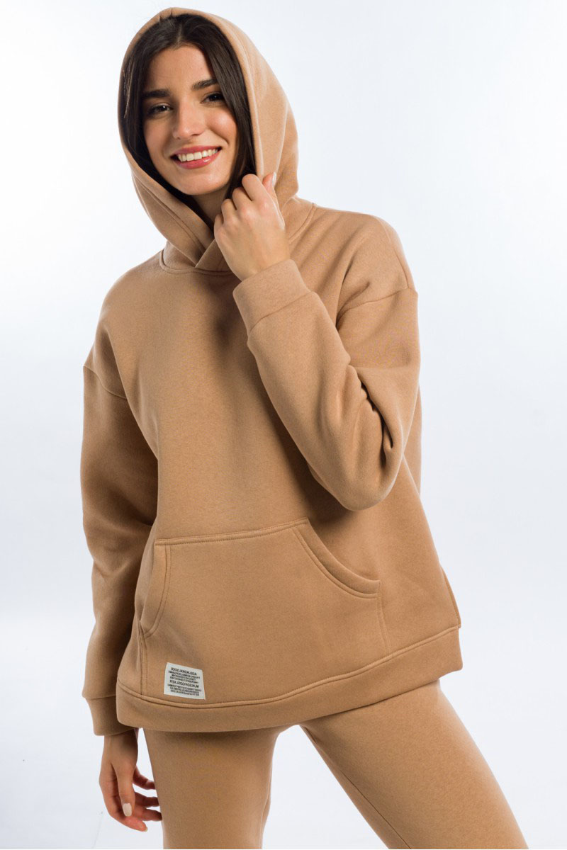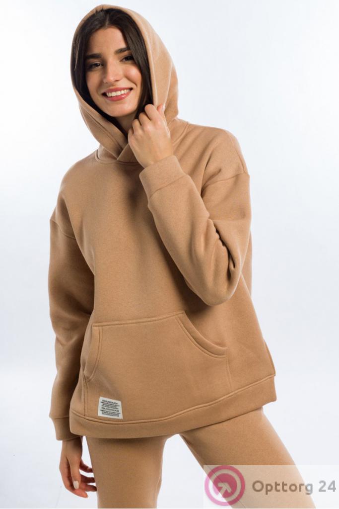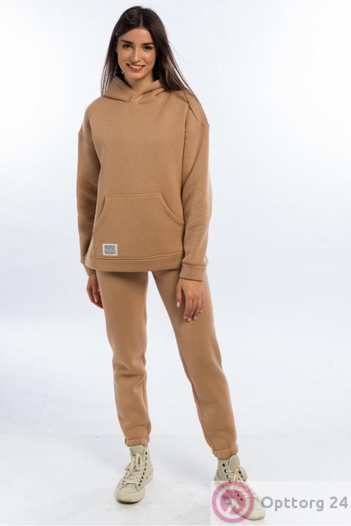 Описание: Костюм женский на флисе спортивного стиля, цвет бежевый. Кофта с карманом кенгуру и с капюшоном. Брюки заужены к низу и на резинке, есть два кармана.