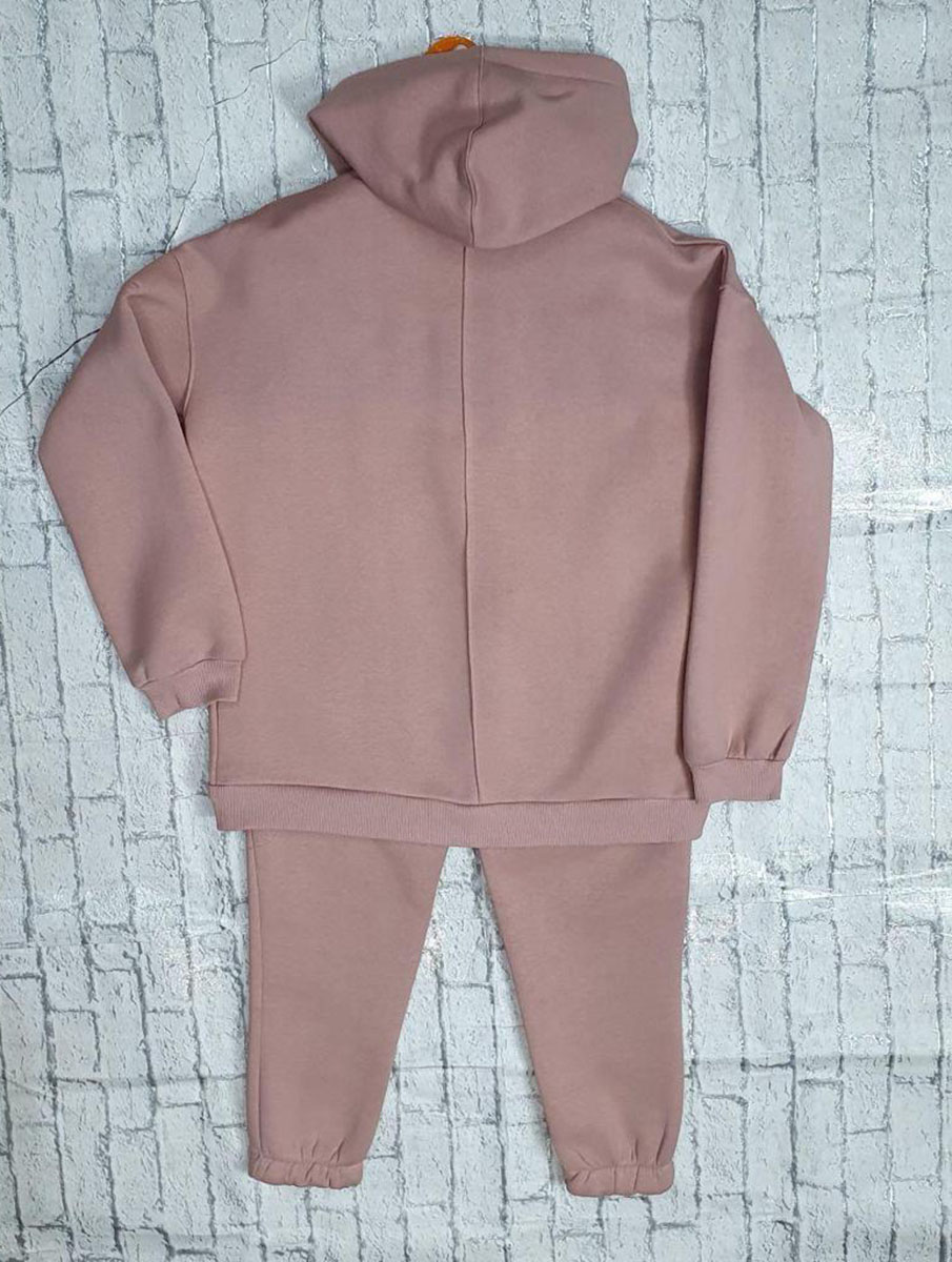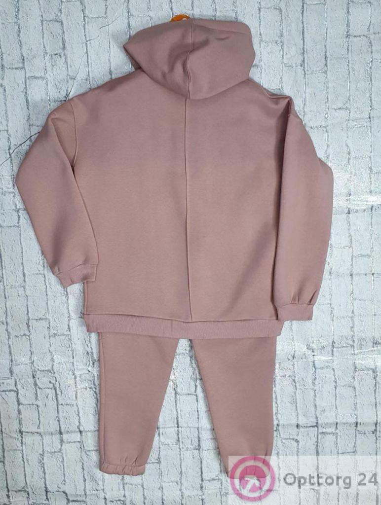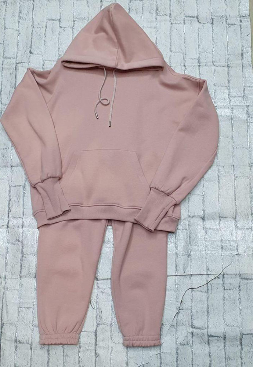 Описание: Костюм женский однотонный, нежно-розового цвета. Состоит из: кофты и брюк. Кофта с капюшоном и карманом кенгуру. Манжеты и низ кофты на трикотажной резинке. Брюки с низу на резинке.