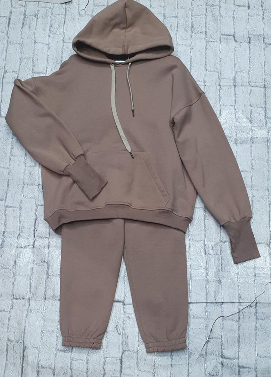Описание: Костюм женский однотонный, состоит из: кофты и брюк. Кофта с капюшоном и карманом кенгуру. Манжеты и низ кофты на трикотажной резинке. Брюки с низу на резинке.