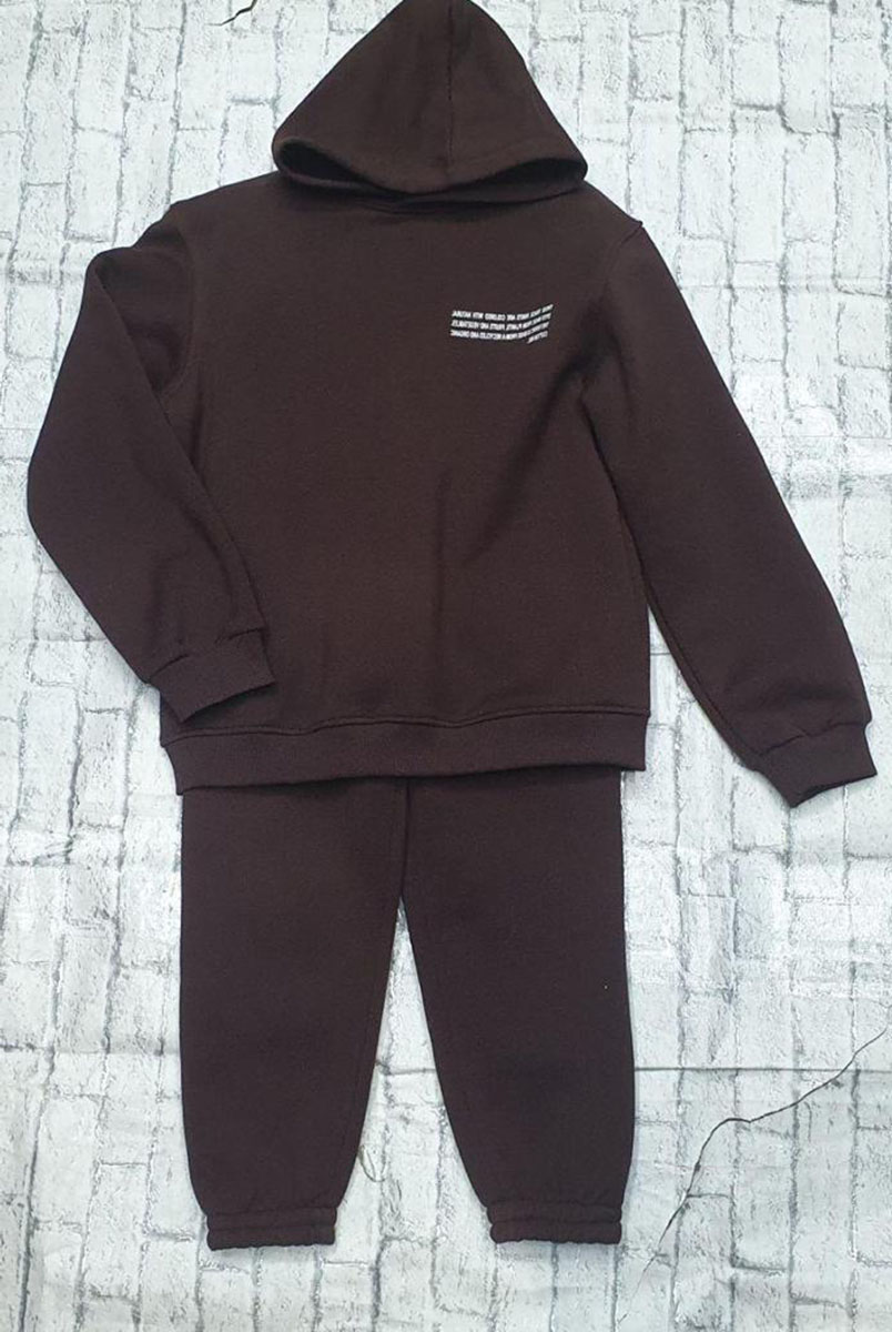 Описание: Костюм женский однотонный, шоколадного цвета. Состоит из: кофты и брюк. Кофта с капюшоном. На груди белая надпись. Манжеты и низ кофты на трикотажной резинке. Низ брюк на резинке.