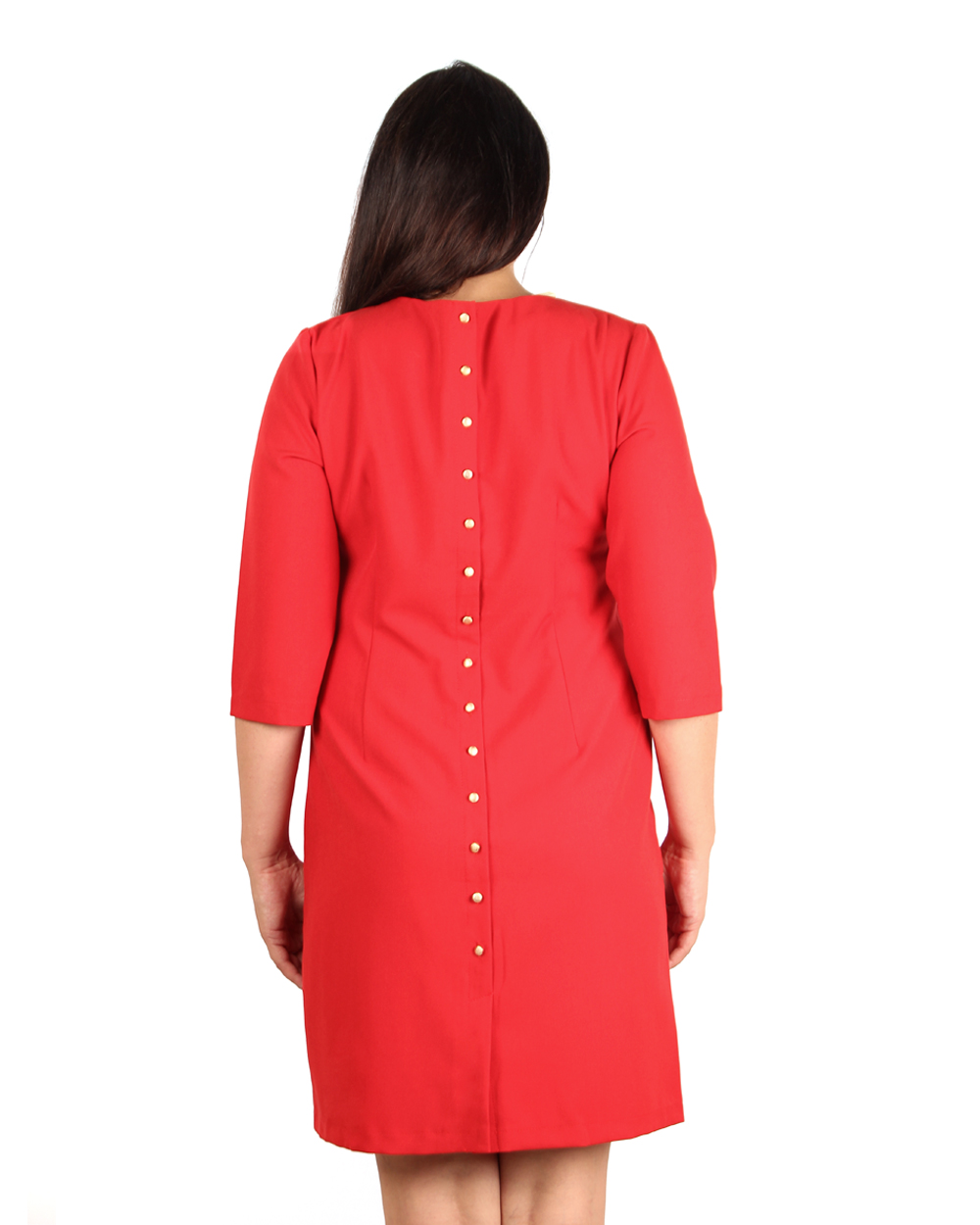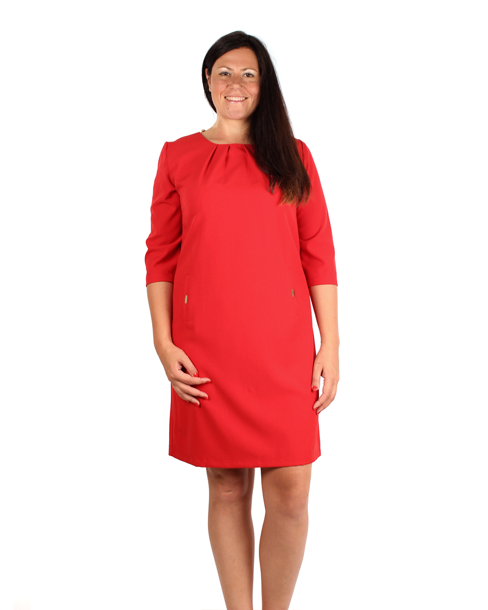 Фасон платья полуприлегающего силуэта, слегка приталенное боковыми швами. Горловой вырез овальный, средней глубины. Край горловины декорирован сборкой, что акцентирует внимание на женской груди. Рукава-реглан свободного кроя, три четверти. Длина платья чуть выше колен.Представленное платье очень выгодно скрывает пышные формы, подчеркивая достоинства фигуры.